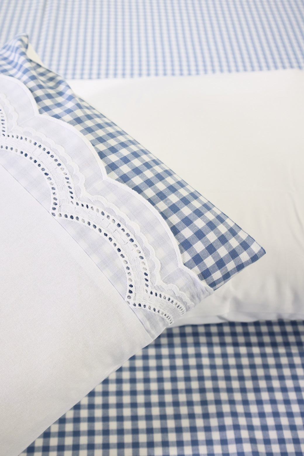 Charming Gingham & Embroidered Lace Bedding Set Transform your bedroom into a cozy retreat with this high-quality yarn-dyed gingham check set. Featuring intricate computer-aided embroidery and delicate lace details, this set offers a perfect balance of traditional pattern and feminine elegance.Product SpecificationsFeatureDetailsFlat Sheet Size106" x 108" (Super King/Extra Large coverage)Pillowcase Size17" x 27" (Set of 2)FabricPremium Yarn-Dyed Woven Gingham CheckHemmingProfessional 1cm clean-edge hemming on the flat sheetDesign & Craftsmanship DetailsYarn-Dyed Woven Gingham: The bed sheet features a timeless small-scale gingham check in a classic blue and white palette. Because the yarns are dyed before weaving, the pattern is crisp, vibrant, and incredibly resistant to fading.Artisanal Pillowcase Fronts:Solid Sheeting Base: The main body of the pillowcase is crafted from smooth, white solid sheeting for a soft feel against the face.Computerized Embroidery: Decorative blue bow motifs are precision-embroidered using computer-guided technology for a flawless, symmetrical finish.Check Patch & Scalloped Lace: One side of the pillowcase is accented with a yarn-dyed woven check patch, bordered by a beautiful, white scalloped "round lace" embroidery that adds dimension and a vintage touch.Functional Design:Solid Color Back: The reverse side of the pillowcase is made from solid color sheeting to maintain a sleek look.Side Opening: Designed with a practical side opening for easy pillow insertion and removal.Refined Finishing: The flat sheet is finished with a precise 1cm hem, ensuring a clean, modern drape that complements the intricate pillow design.Care InstructionsMachine wash in cold water with similar colors. Use a gentle cycle to protect the delicate lace and embroidery. Tumble dry on low heat or hang dry to maintain the crispness of the gingham weave.