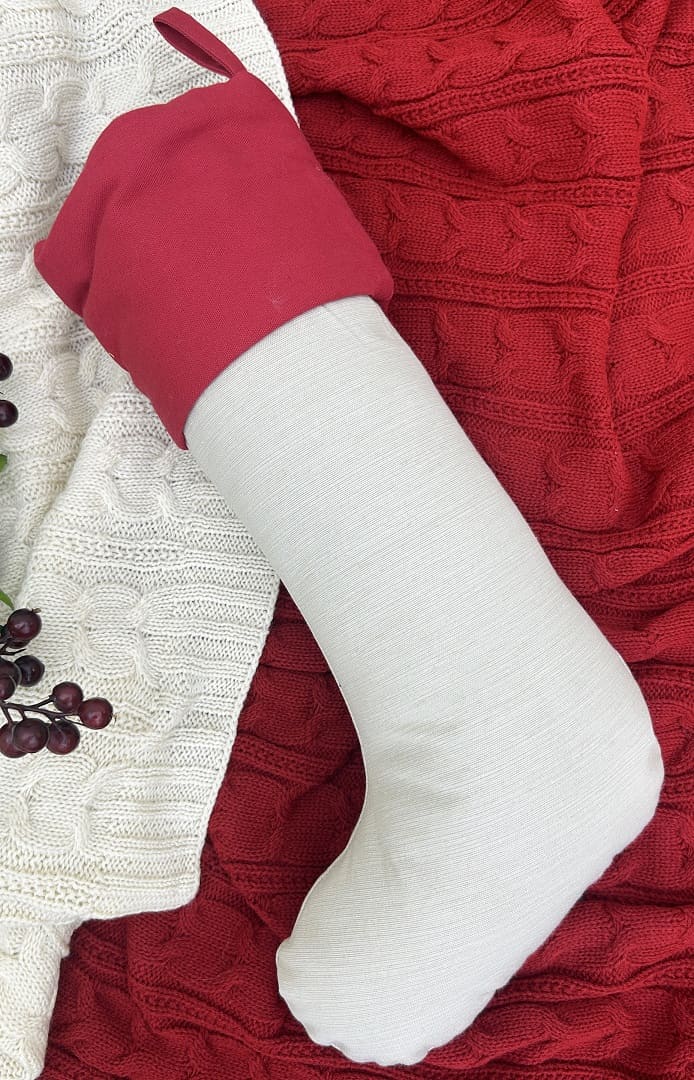 Classic "Merry Christmas" Embroidered StockingProduct OverviewCelebrate the season with this classic Christmas stocking, featuring a timeless design that perfectly balances rustic texture with festive color. The natural woven body is beautifully embroidered with a greeting, and topped with a bold, solid red cuff, making it an essential piece for your holiday mantel.Detailed SpecificationsFeatureDescriptionDimensions10 inches (Width) x 20 inches (Length)DesignTraditional stocking shape with a sturdy hanging loop and a substantial contrasting cuff.Main FabricWoven texture fabric in a natural, off-white hue. The woven texture adds a rustic, artisanal feel.EmbroideryFeatures machine embroidery of the phrase "Merry Christmas" in a cheerful, script font using deep Red thread.Cuff/Flap5-inch contrasting flap made from solid Red fabric, providing a pop of traditional holiday color.Back FabricIdentical natural woven texture fabric (un-embroidered).Lining/FillingInner layer of 80 GSM Poly Wadding (polyester batting) for structure, slight padding, and shape retention.ColorNatural/Off-White body with Bright Red Cuff and Embroidery.StyleTraditional, Rustic Christmas Decor.Key FeaturesFestive Greeting: The bold "Merry Christmas" script embroidery serves as the perfect centerpiece for your holiday display.Textural Contrast: Combines the rustic, tactile feel of the natural woven body with the smooth finish of the solid red cuff.Traditional Color Palette: The classic red and white color scheme effortlessly complements other holiday decorations.Sturdy and Padded: Filled with 80 GSM poly wadding, the stocking holds its elegant shape whether it's empty or filled with treats.