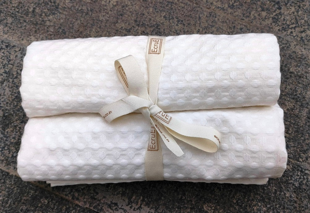 Upgrade your kitchen linen collection with this premium set of two classic white waffle weave kitchen towels. The distinct honeycomb texture is not just visually appealing but is engineered to enhance the natural absorbency of cotton, making these towels highly efficient and fast-drying. Measuring a functional 18" x 28", they are an essential and timeless addition to any kitchen.