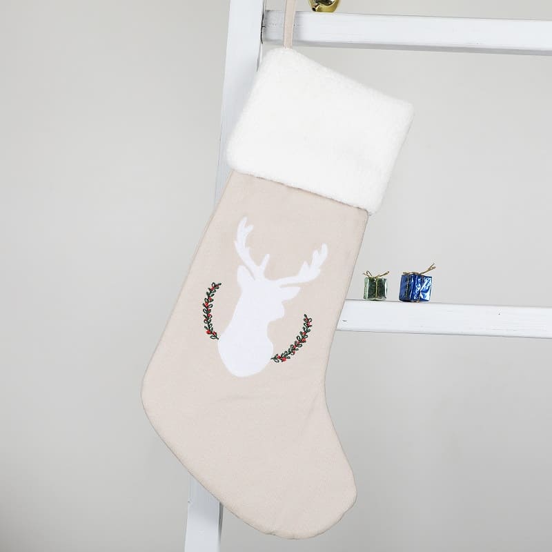 * Deer Applique and Embroidery: The stocking is beautifully adorned with a white deer applique and embroidery.