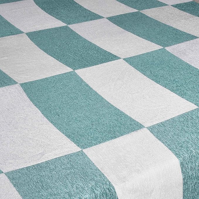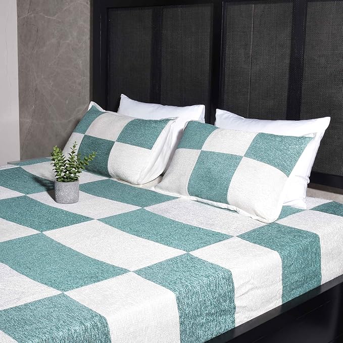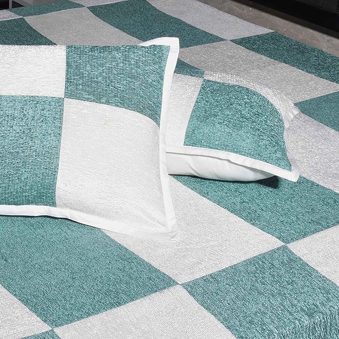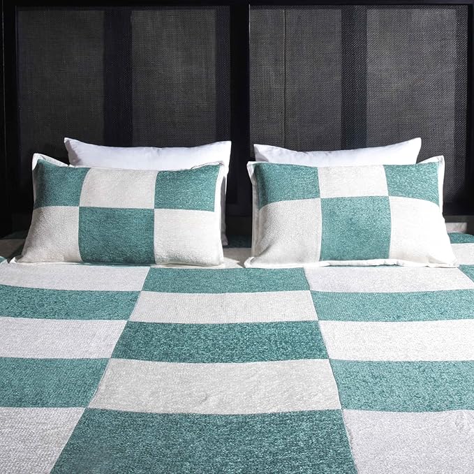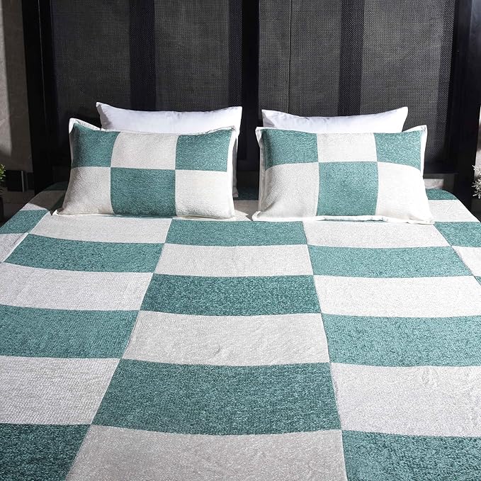 Elegant Chenille & Cotton Woven Bed Cover Set - Cream & Green Checkerboard Design