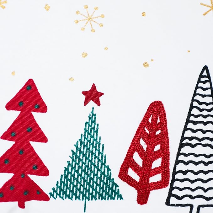 This festive pillow features a charming design of Christmas trees and snowflakes embroidered on a beige background. The trees are adorned with stars, stripes, and other decorative elements, adding a touch of whimsy to the design. The pillow is made from high-quality materials and is machine washable for easy care.