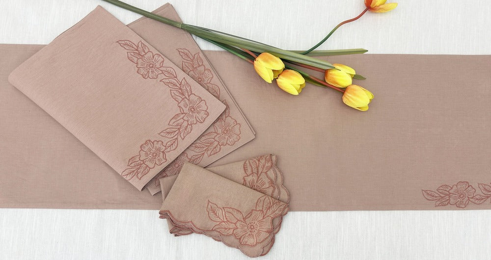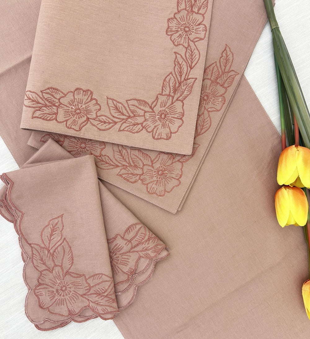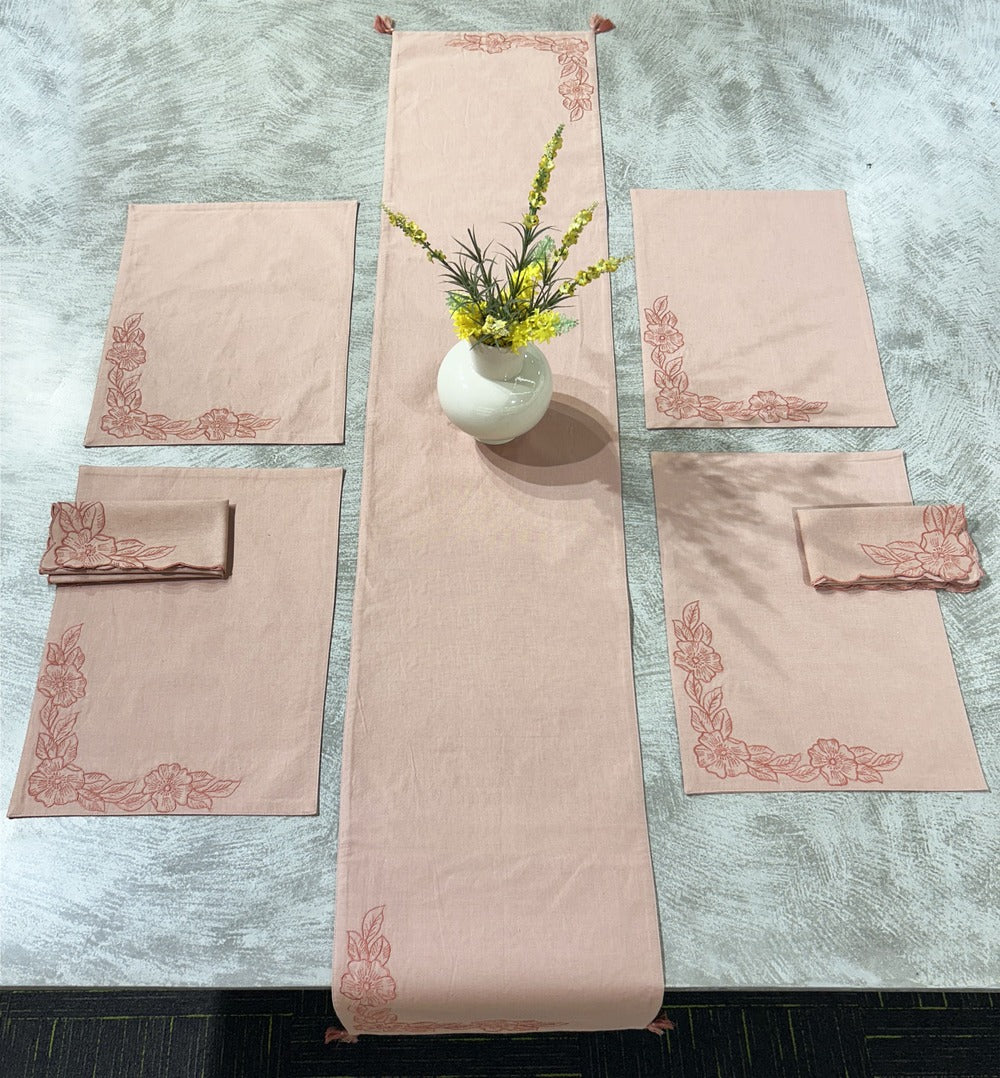 This elegant and complete table linen set is designed to add a touch of sophistication and charm to your dining table. The set features a beautiful, cohesive design with intricate floral embroidery, perfect for both everyday use and special occasions.