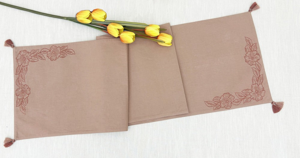 Runner: The runner serves as the central piece, holding the entire look together. It is likely solid-colored to highlight the embroidered details on the other pieces.