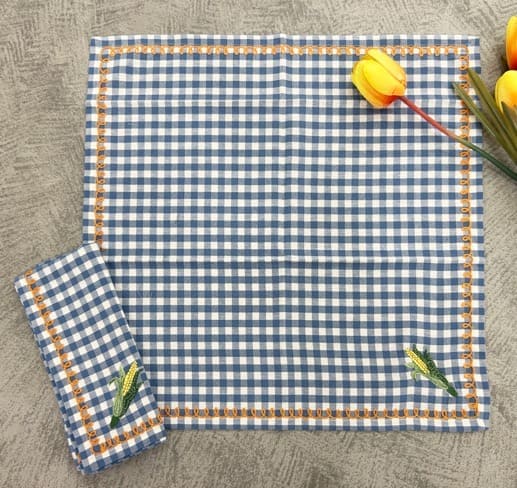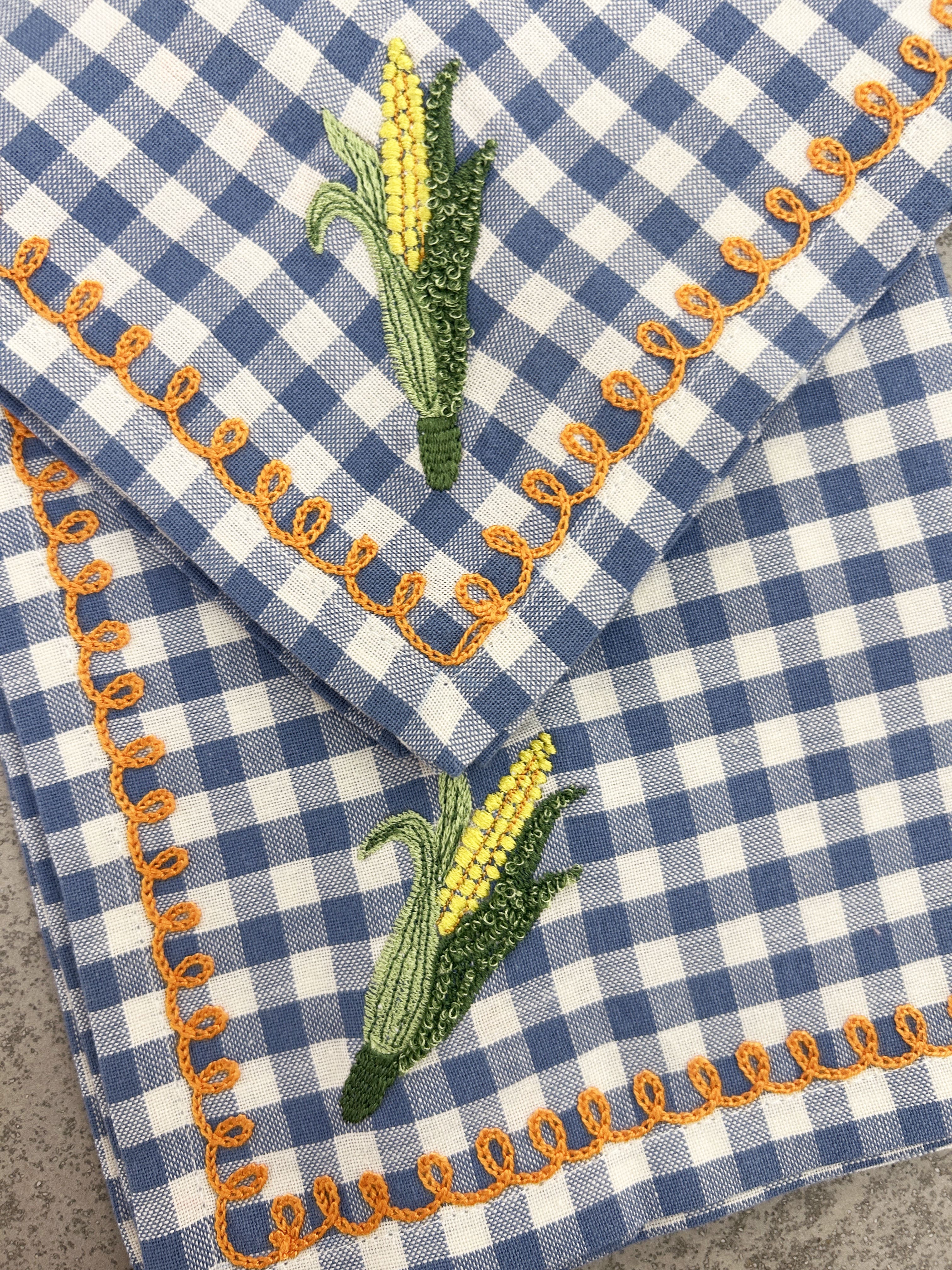Design: Each napkin is accented with delicate embroidery. The border is stitched with a simple yet elegant orange thread, providing a lovely contrast to the blue and white check. A charming embroidery of a yellow corn on the cob with green husks is positioned in one corner, adding a unique and playful detail.