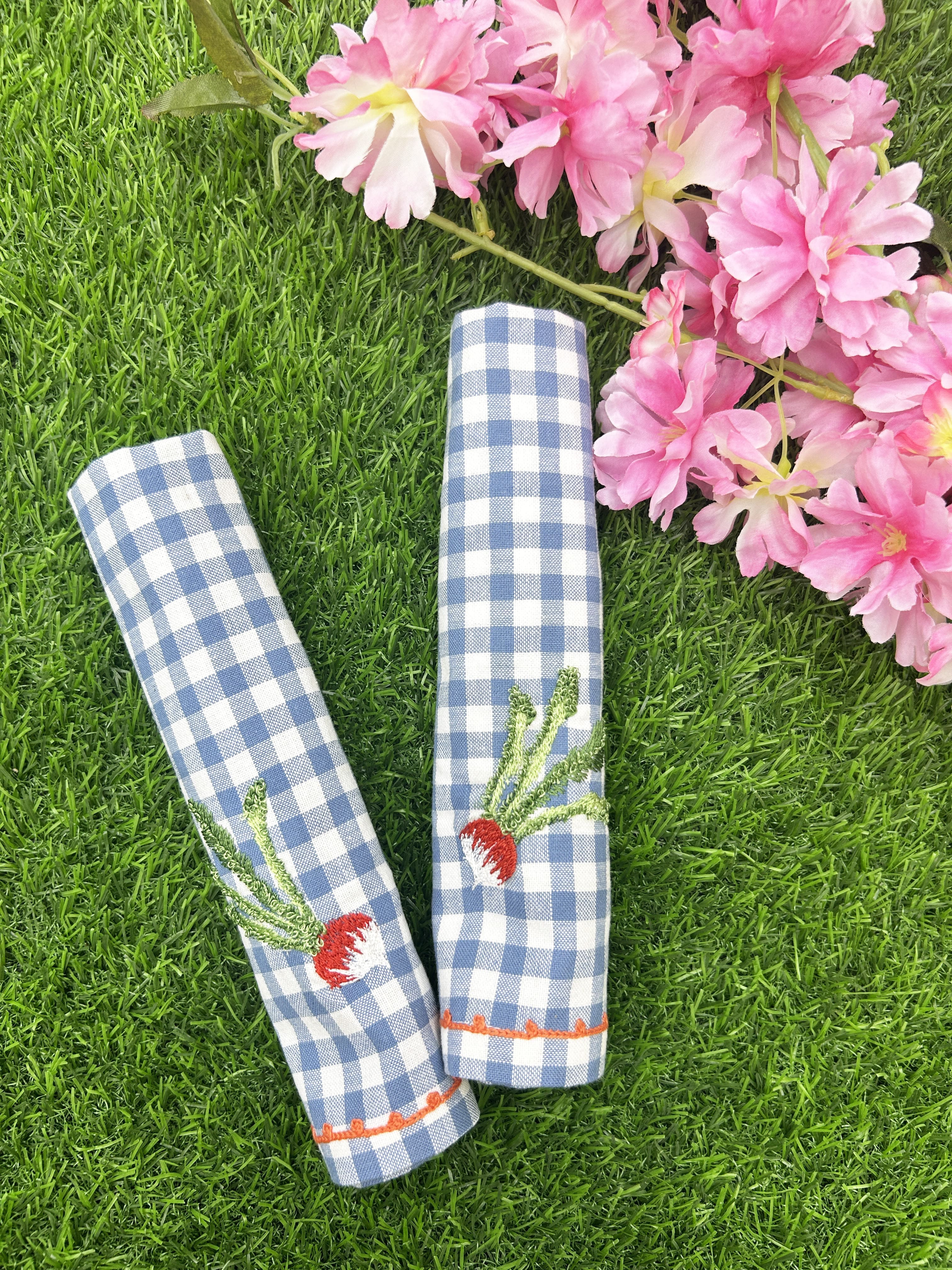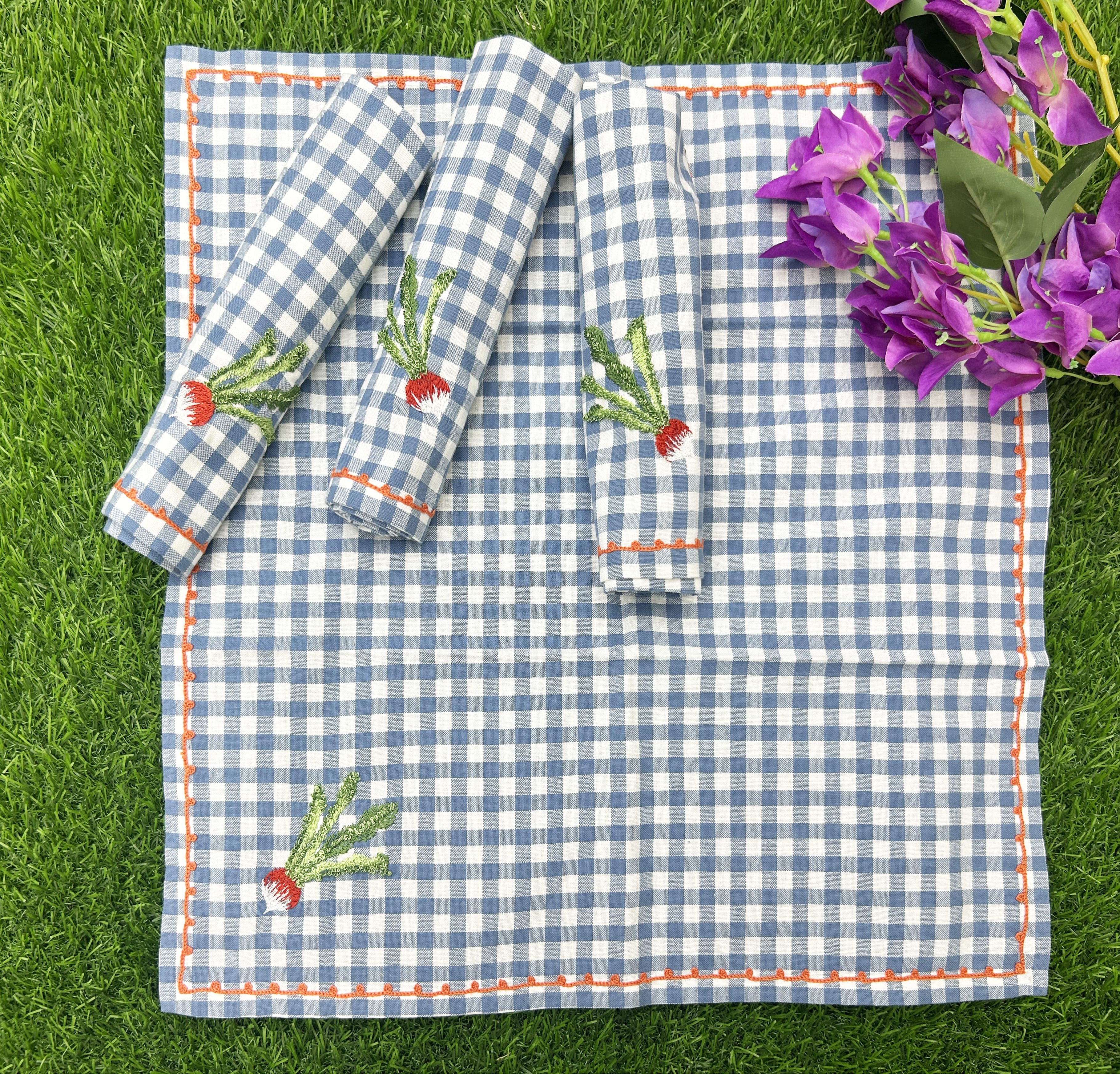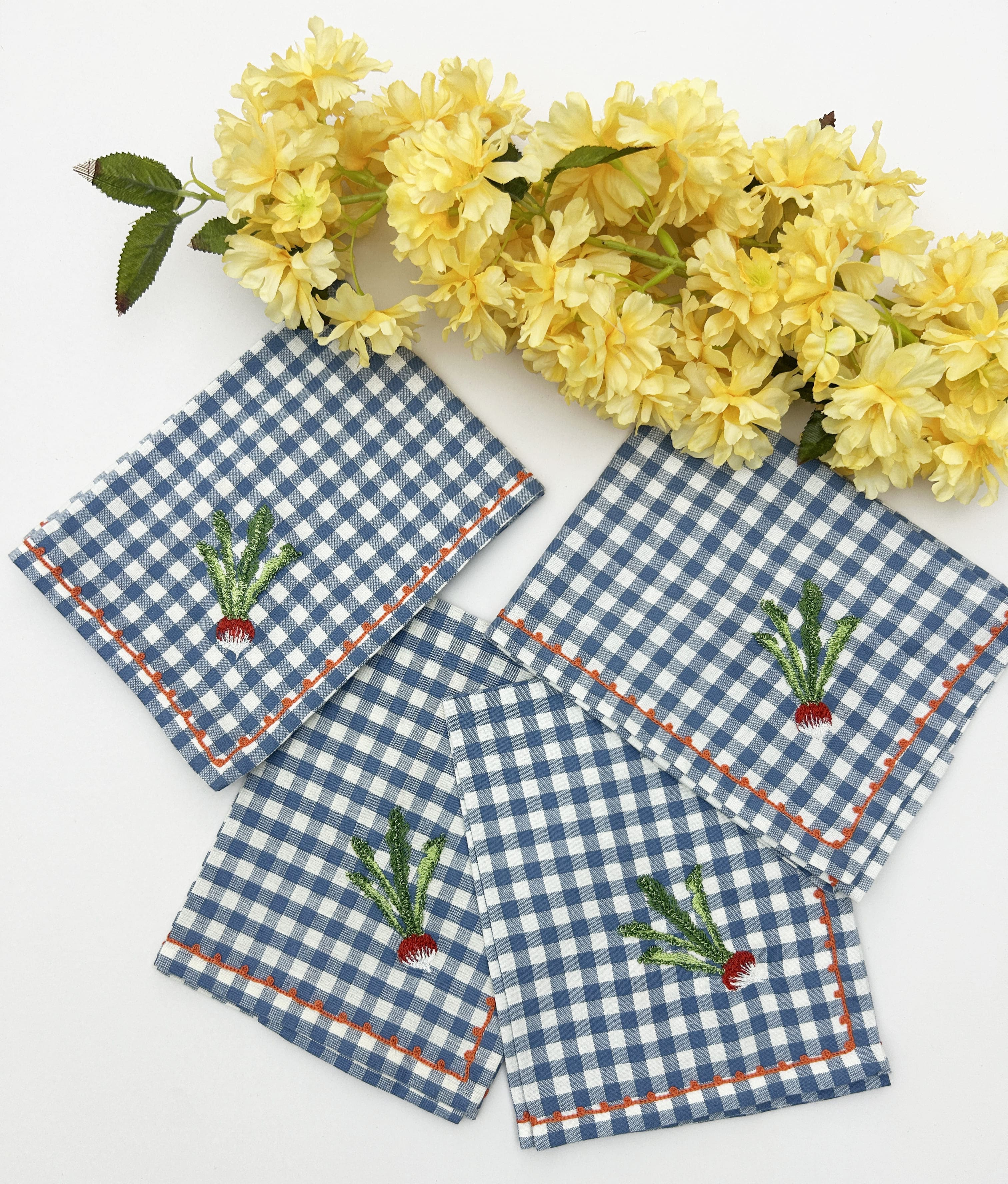 Embroidery: The set is beautifully accented with two types of embroidery. The main design is a whimsical and detailed radish, complete with a vibrant red root and lush green leafy top, stitched in one corner of the napkin. The edges are finished with a simple, contrasting orange embroidered border, which frames the napkin nicely and complements the radish motif.