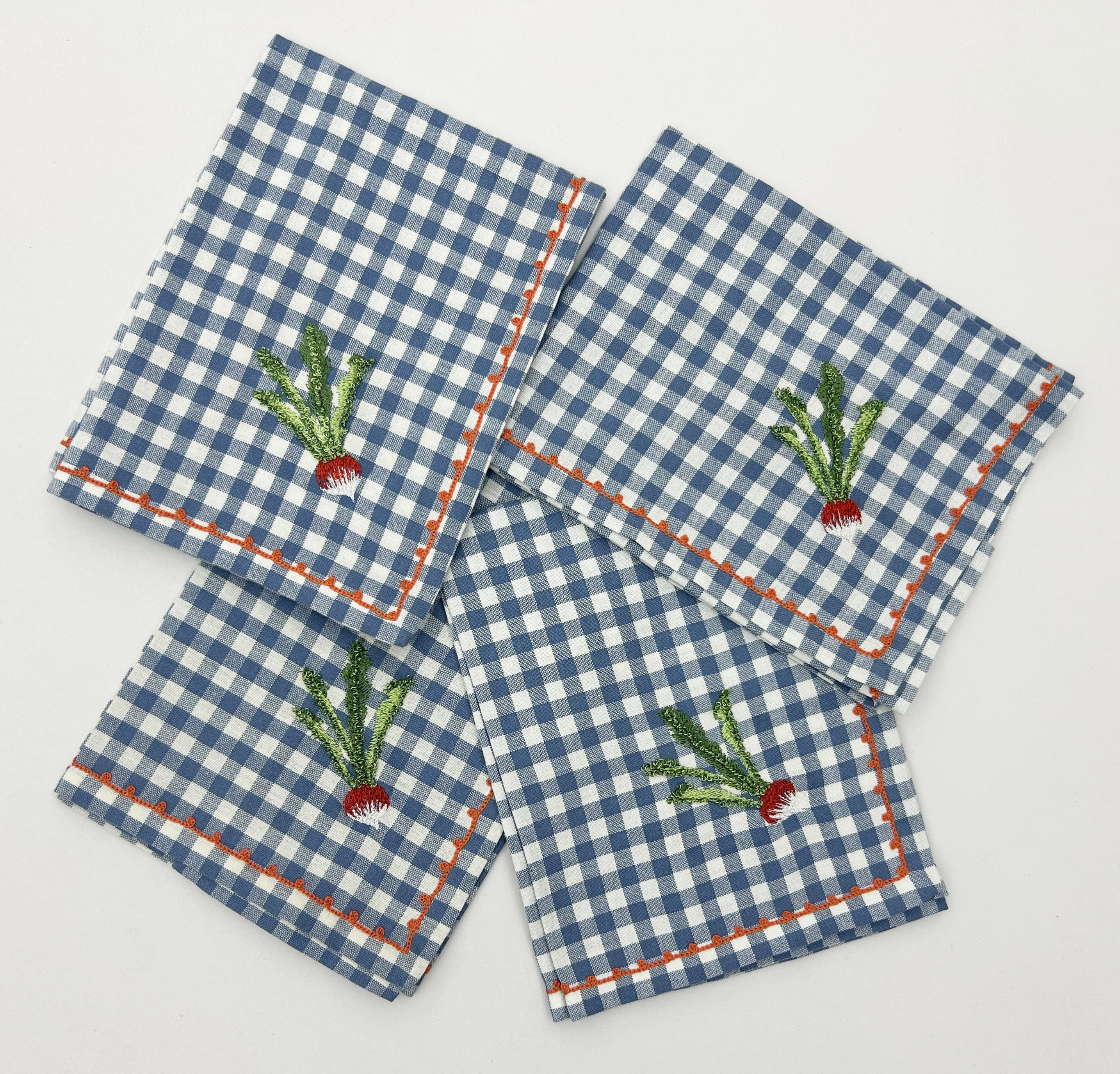 Pack Size: This set includes four napkins, making it an excellent choice for family meals or a small dinner party. The image shows three napkins rolled up, each with a visible radish embroidery, and one laid flat, highlighting the overall design.