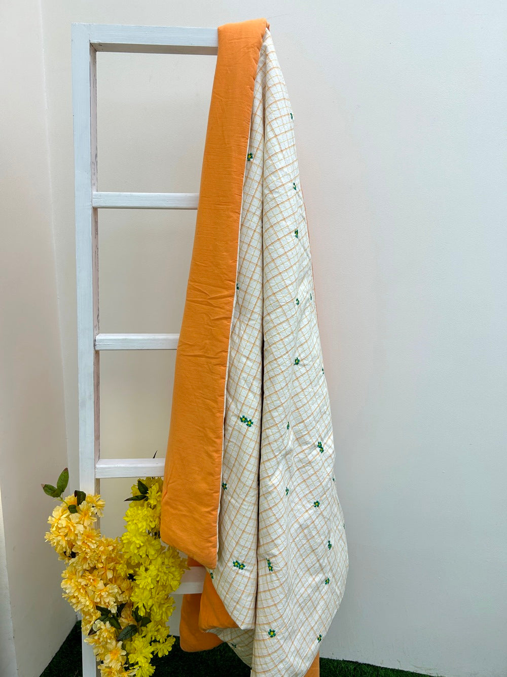 The front fabric is a yarn-dyed woven check pattern. This means the colored threads were woven together to create the check design, resulting in a more vibrant and long-lasting pattern compared to printed checks. The front also features floral embroidery scattered across the surface, adding a decorative touch.
