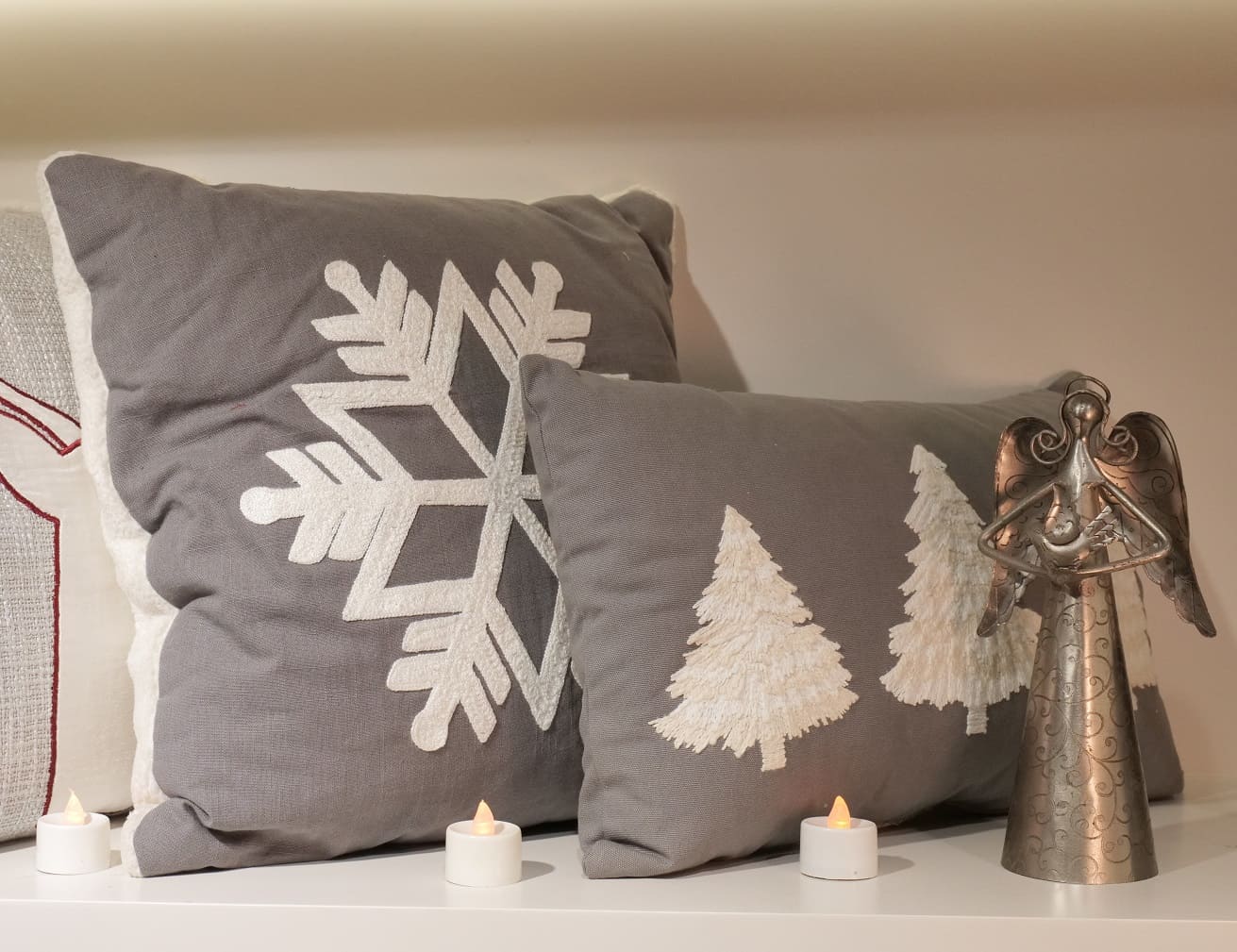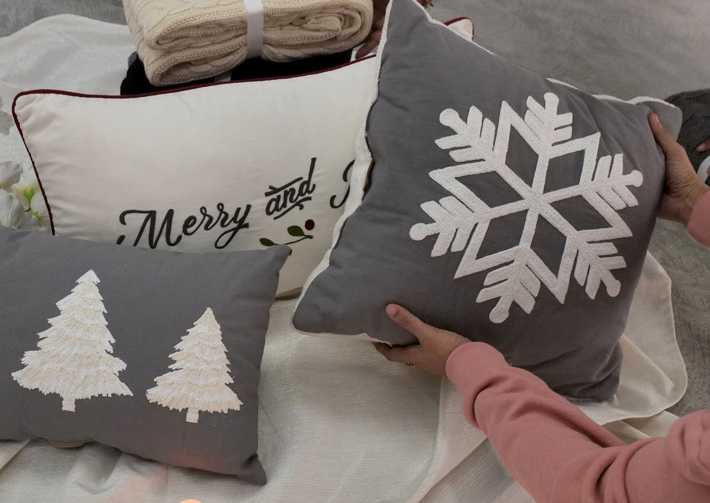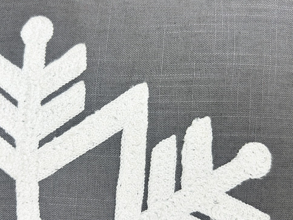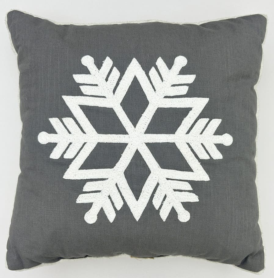 Embroidered Snowflake Decorative Throw Pillow Key Features Design: A stylish cushion featuring a large, intricately embroidered white snowflake centered on the front. Seasonal Appeal: Perfect for winter and holiday décor, adding a cozy and festive touch to any space. Size: 18 x 18 inches (approx. 45 x 45 cm), an ideal size for sofas, armchairs, or beds. Construction & Materials Component Material Specification Details Front Base Fabric 10s Cotton Slub Double-sided solid dyed gray fabric, offering a slight texture and durable feel. Front Embellishment Embroidery Features a prominent, white snowflake design stitched into the center of the front panel. Back Fabric Cream Colour Poly Sherpa Soft, cozy, and plush Sherpa fabric provides a warm, contrasting texture on the reverse side. Closure Bottom Zipper Opening Discreetly placed zipper allows for easy removal of the cushion cover for cleaning or replacement of the insert. Filler/Insert Non-woven Filler with Poly FibreIncludes a cushion insert (filler) pre-filled for immediate use. Filler Filling15 Denier Poly FibreHigh-quality polyester fiber ensures a soft, resilient, and comfortable loft. Summary This 18x18'' Embroidered Snowflake Cushion is a perfect blend of style and comfort for your seasonal home décor. The front showcases detailed white snowflake embroidery on a double-sided solid dyed 10s cotton slub base, providing a rustic yet refined look. The back is constructed from a plush, cream-colored Poly Sherpa fabric for ultimate softness and warmth. A secure bottom zipper ensures the cover is easily removable. Complete with a non-woven filler generously filled with 15 denier poly fiber, this cushion is ready to instantly elevate your living space.