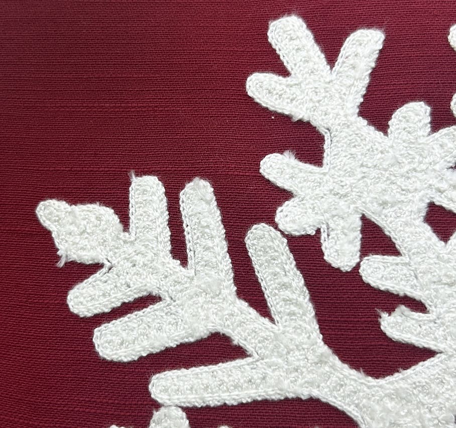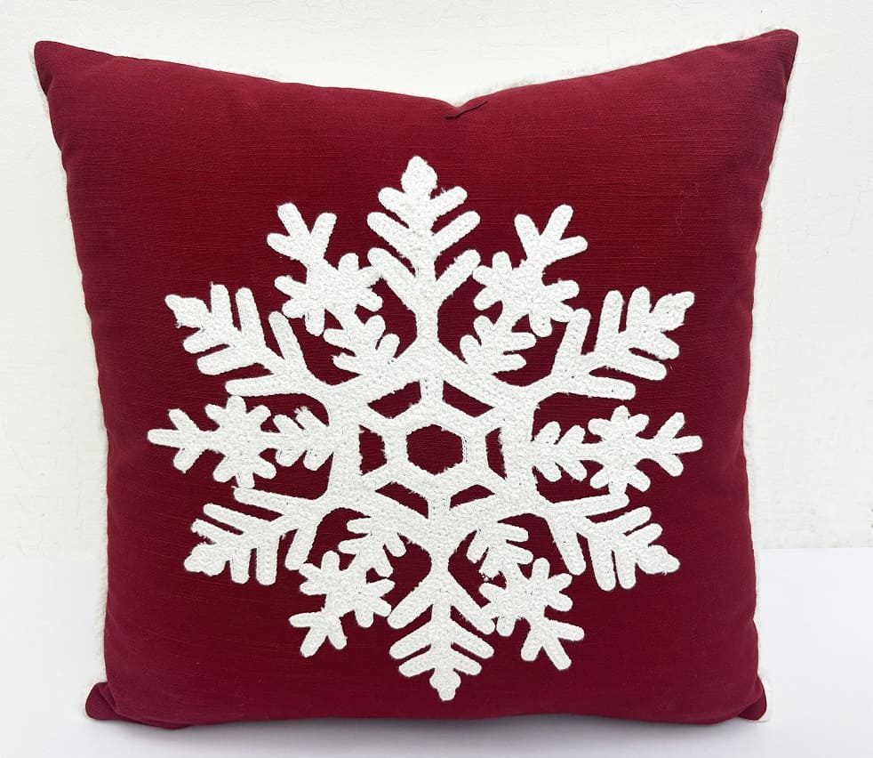 Festive Embroidered Snowflake Decorative Throw Pillow (Red) Key Features Design: Features a prominent white embroidered snowflake for a striking contrast and classic holiday look. Seasonal Appeal: The rich red color and snowflake motif make it the perfect accent for Christmas and winter home décor. Size: 18 x 18 inches (approx. 45 x 45 cm), an ideal square size for decorative layering on sofas, beds, or accent chairs. Construction & Materials Component Material Specification Details Front Base Fabric 10s Cotton Slub Single-sided solid dyed in a rich, festive red color, providing a slight slub texture for a high-quality finish. Front Embellishment Embroidery Features a large, detailed white snowflake design expertly stitched onto the red base fabric. Back Fabric Cream Colour Poly Sherpa Soft, plush, and cozy Sherpa fabric in a natural cream color provides luxurious warmth and texture on the reverse. Closure Bottom Zipper Opening Includes a practical, concealed zipper along the bottom edge for easy removal of the cover. Filler/Insert Non-woven Filler with Poly Fibre Complete with a ready-to-use cushion insert (filler) for immediate fluffiness and comfort. Filler Filling 15 Denier Poly Fibre Resilient and comfortable polyester fiber filling ensures the cushion maintains its shape and loft. Summary Add a touch of holiday warmth with this stunning 18x18'' Embroidered Snowflake Cushion. The front panel boasts a vibrant, solid-dyed red 10s cotton slub fabric that serves as a beautiful backdrop for the intricate white snowflake embroidery. The reverse side offers contrasting comfort with soft, cream-colored Poly Sherpa fabric, making it fully reversible in feel. Complete with a bottom zipper opening for convenience and filled with a plush 15 denier poly fiber insert, this cushion is ready to bring festive cheer and cozy texture to your home.