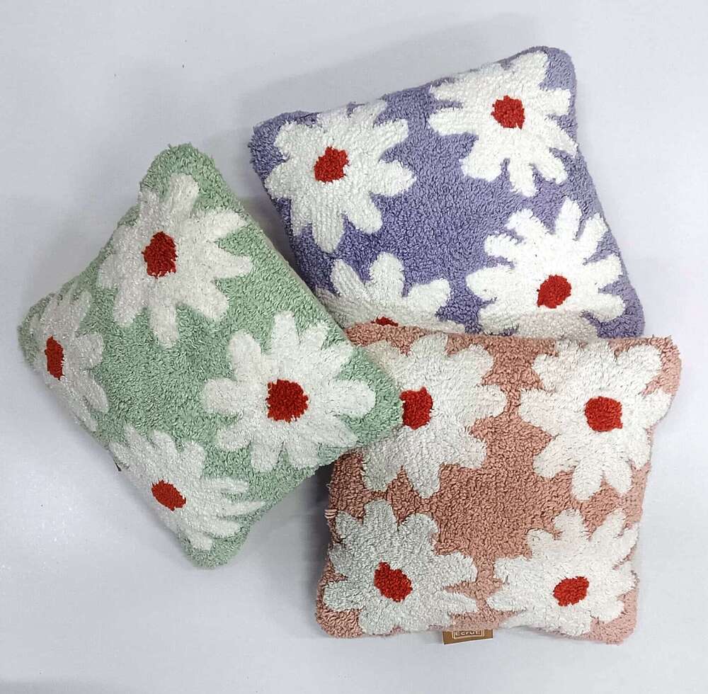 This is a charming and textured square cushion, measuring 10x10 inches. It features a delightful floral pattern created with a tufted technique, giving it a soft and tactile surface. The cushion showcases four stylized daisy-like flowers in a creamy white color. Each flower has a distinct, textured feel due to the tufting. The centers of the flowers are a warm, reddish-brown or terracotta color, providing a lovely contrast to the white petals and adding a focal point to each bloom.