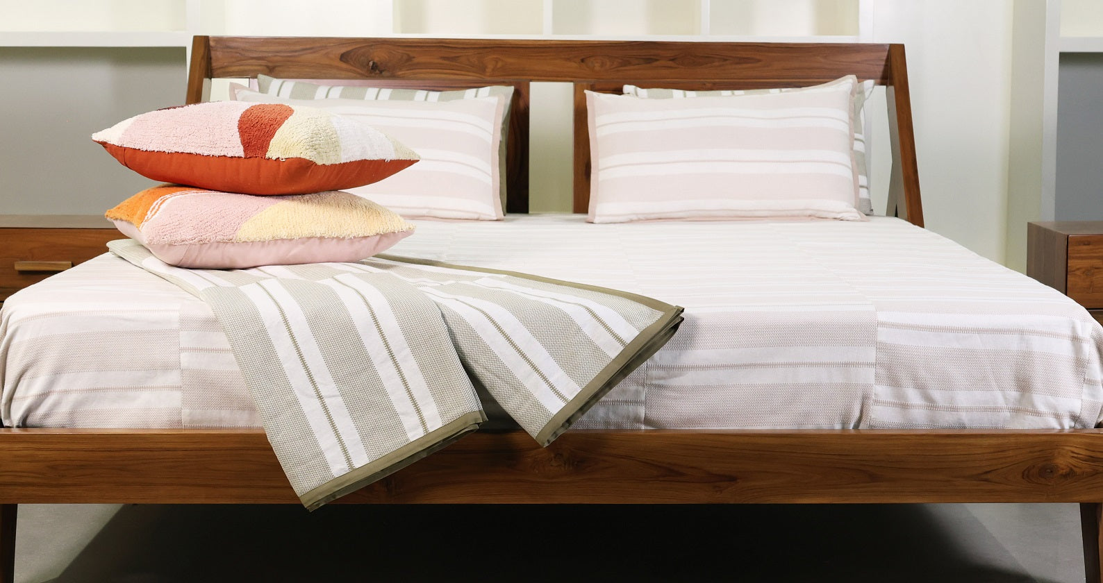 Heritage Stripe Woven Bed Cover Set - Beige Elevate your bedroom with the sophisticated textures of our Heritage Stripe Bed Cover. This set moves beyond simple patterns, featuring a complex patchwork face and premium finishing details that define luxury home textiles.Product SpecificationsFeatureDetailsBed Cover Size106" x 106" (Tailored for Queen/King coverage)Pillowcase Size17" x 27" (Set of 2)ColorwayWarm Beige and Soft IvoryFabricPremium Yarn-Dyed Woven Heritage StripePiping1/2" Solid Color Piping on all edgesDesign & Premium ConstructionIntricate Patchwork Face: The front of the bed cover is crafted from yarn-dyed woven heritage stripe fabric, meticulously arranged in a patchwork layout to add visual depth and architectural interest to the beige color palette.Designer Piping: Every edge of the bed cover is finished with a 1/2" solid color piping. This border is made from the same high-quality solid sheeting as the backing, providing a crisp, structural frame to the design.Coordinated Pillowcases: * Striped Fronts: The pillowcases feature the primary yarn-dyed woven stripe to match the bed cover's focal pattern.Full Piping: Just like the cover, the pillows are finished with all-side solid color piping for a unified, boutique-hotel aesthetic.Quality Backing & Access:Solid Sheeting: The reverse side of both the cover and the pillows is made from solid color sheeting, ensuring a smooth, soft surface against the skin.Side Opening: The pillowcases include a practical side opening, allowing for a seamless look while making it easy to change your bedding.Care InstructionsMachine wash in cool water with similar neutral tones. To keep the patchwork flat and the piping crisp, tumble dry on low and remove promptly. A warm iron can be used on the stripe panels to enhance the "heritage" woven texture.