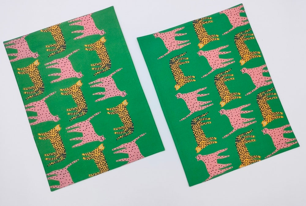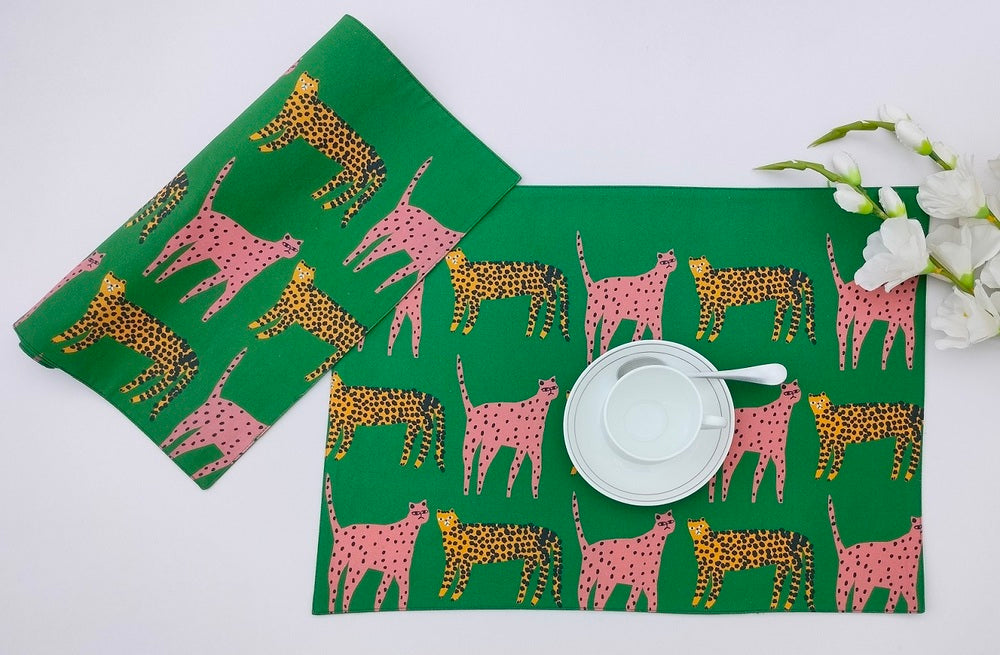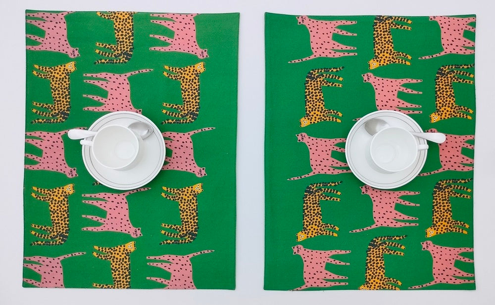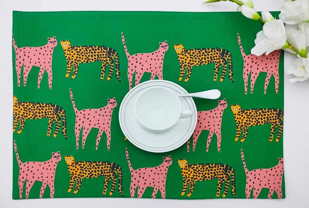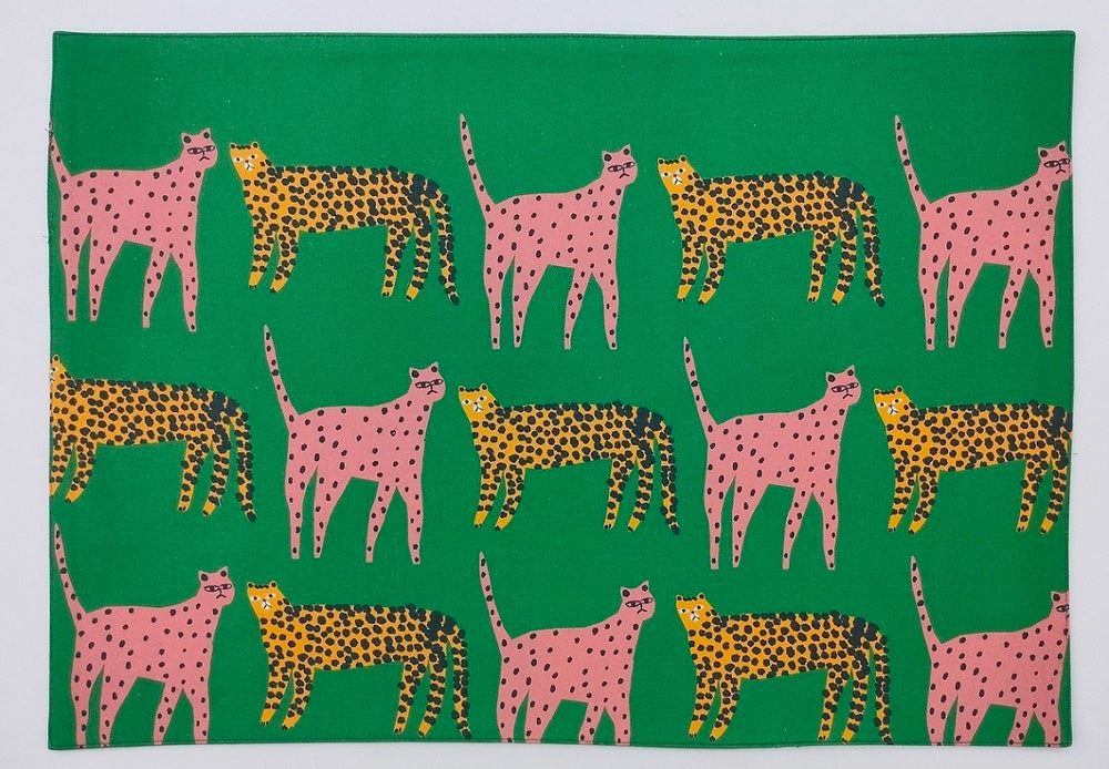 * Print: The placemat features a bold and whimsical printed pattern of stylized leopards. There are two types of leopards: one with a classic yellow and black spotted pattern and another in a playful pink with darker pink spots. The animals are arranged in an alternating, repeating pattern against a vibrant green background.