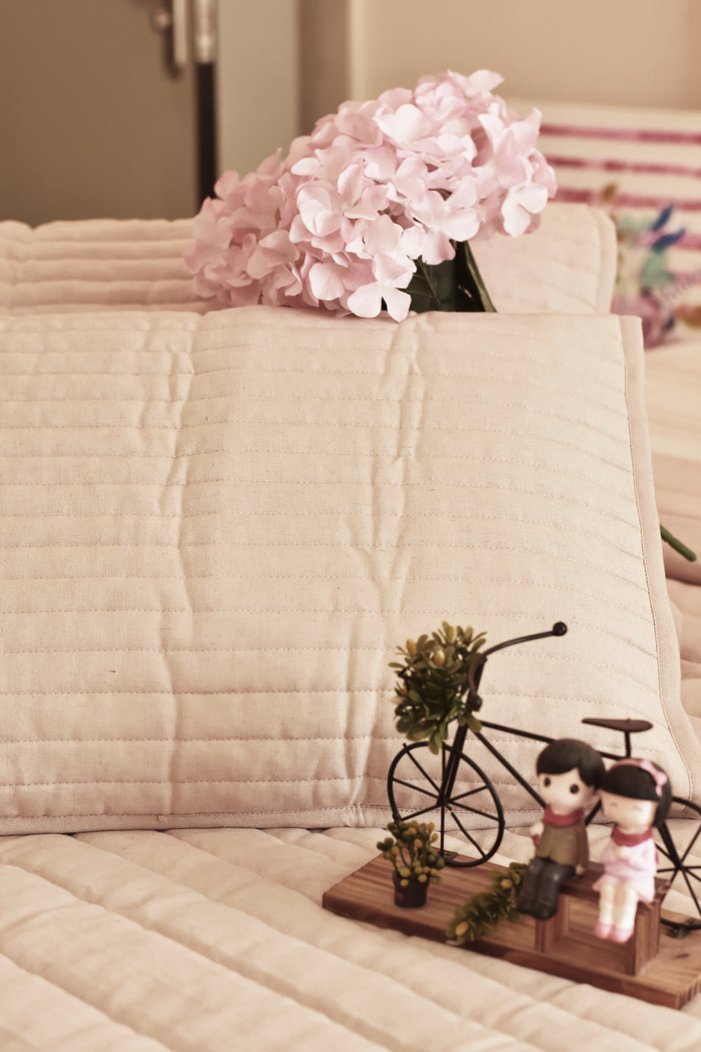 Decorative Touches: The image also shows a small figurine and a pink hydrangea, suggesting a styled bedroom setting.