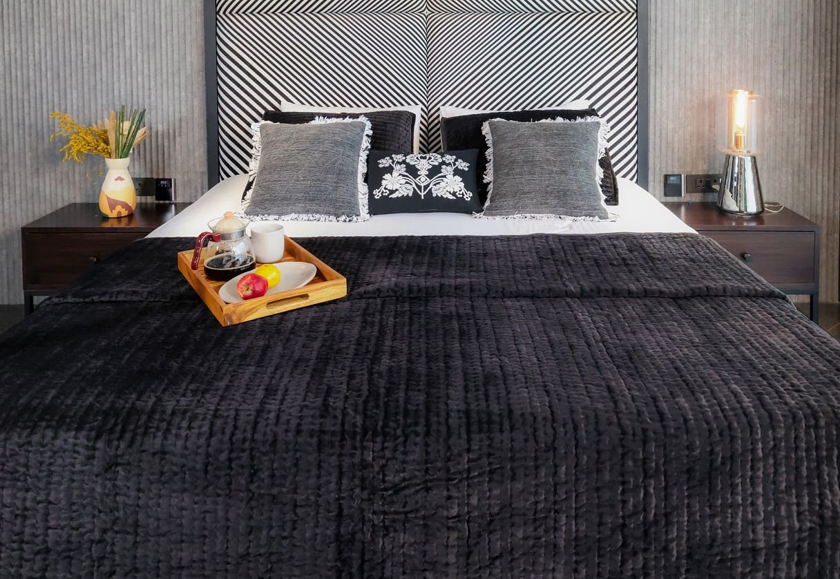Experience ultimate comfort and luxury with our Viscose Velvet Channel Quilted Quilt Set, a sophisticated addition to any bedroom that balances high-end texture with clean, modern lines.Product OverviewCrafted for those who appreciate a rich, tactile experience, this set features a lush cotton-viscose velvet front that provides an elegant sheen and an incredibly soft feel. The meticulous channel quilting adds architectural structure, while the poly satin reverse ensures a smooth, cool touch against the skin.Design & CraftsmanshipFront Fabric: A premium Cotton-Viscose Velvet blend, solid-dyed for deep, consistent color that subtly catches the light.Reverse Side: Backed with Solid Color Poly Satin, offering a silky, snag-resistant finish that feels luxurious through the night.Quilting Detail: Features precise Machine Channel Quilting, creating long, parallel columns that add depth and a modern geometric aesthetic.Edge Finish: Every piece is framed with all-side velvet piping, providing a tailored, durable border that reinforces the quilt's shape.Premium Fill & Structure: Stuffed with a 175gsm 7-denier poly wadding for a medium-weight loft that is perfect for year-round use. It includes an internal non-woven lining to ensure the filling remains evenly distributed and never shifts.SpecificationsComponentDimensionsMaterial DetailsQuilt102" x 104" (Oversized King)Cotton-Viscose Velvet Front / Poly Satin BackShams (Set of 2)20" x 26" (Standard)Matching Channel Quilted VelvetFilling175 GSMHigh-loft 7 Denier Poly WaddingLiningInternalNon-woven interliningFinishPipingColor-matched Velvet TrimCare InstructionsTo maintain the exquisite pile and sheen of the velvet:Professional Dry Clean Recommended to ensure the fabric and quilting remain in pristine condition.If home laundering, use a large-capacity machine on a cold, delicate cycle.Tumble dry on low heat or air dry to prevent heat damage to the viscose fibers.Avoid direct ironing; use a steamer at a safe distance to remove any packaging folds.