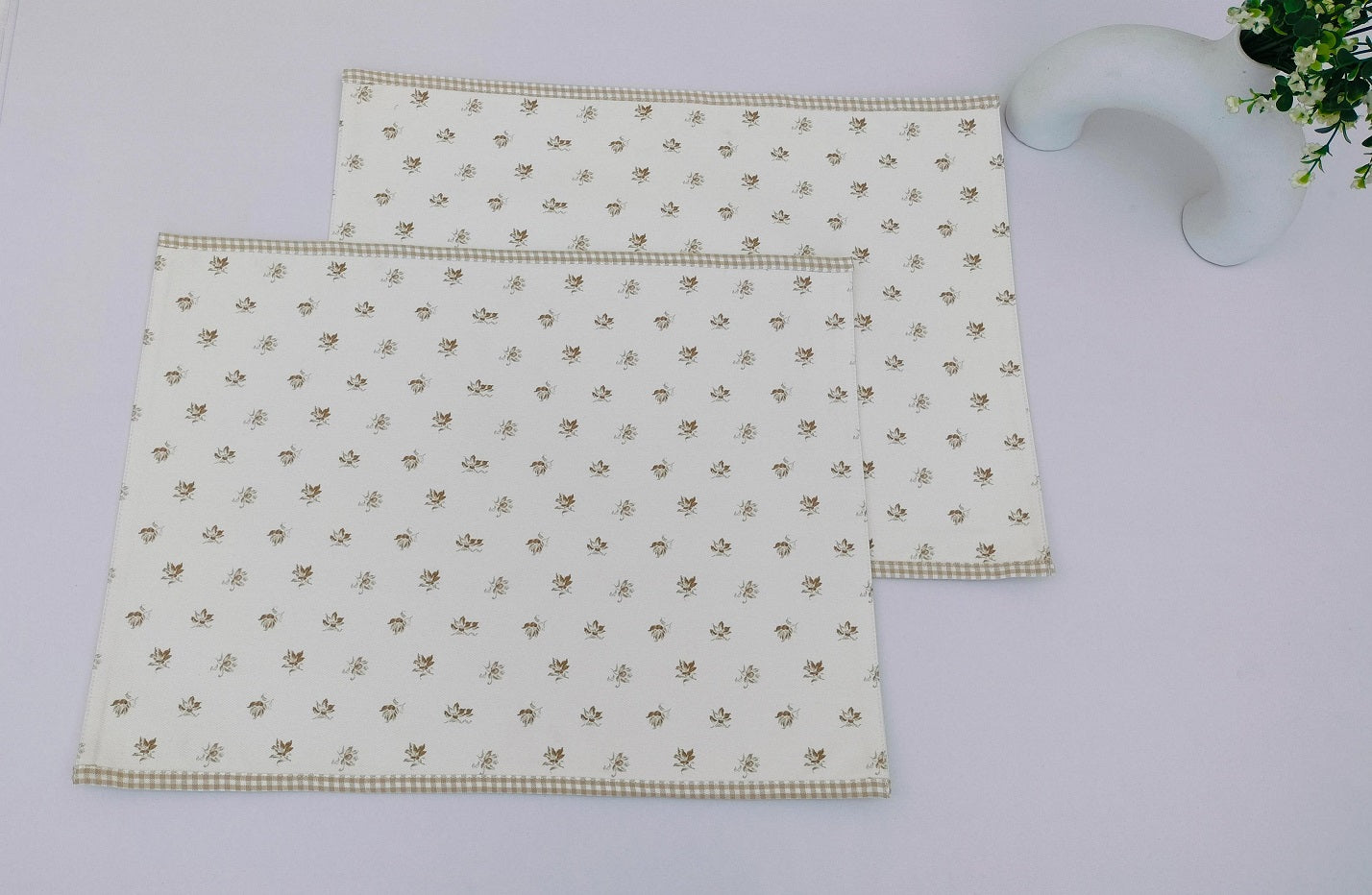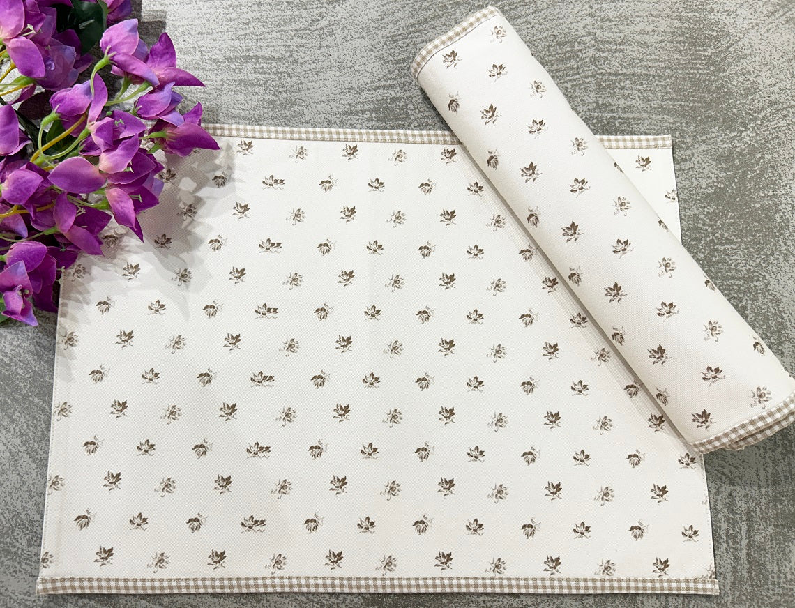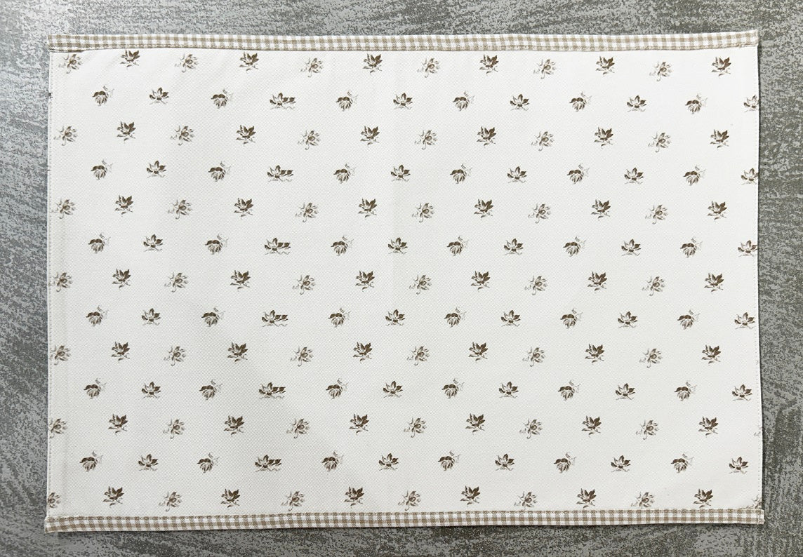 Front Fabric: Cotton twill with a print. This durable and sturdy fabric is ideal for placemats. The front surface features a delicate and repeating all-over print of a small, stylized floral or leaf motif in a soft, brown or taupe color, set against a light, off-white or cream background.