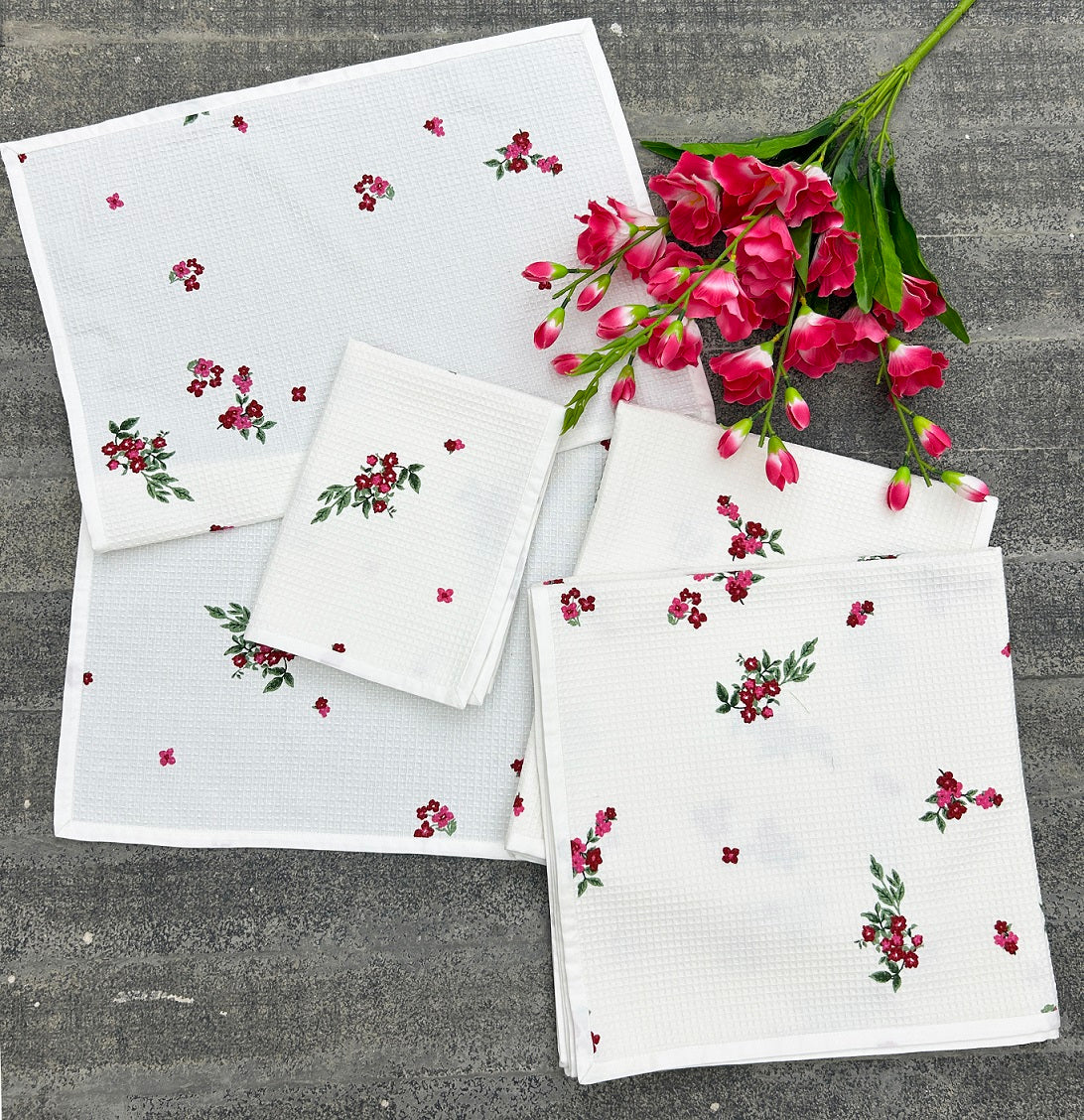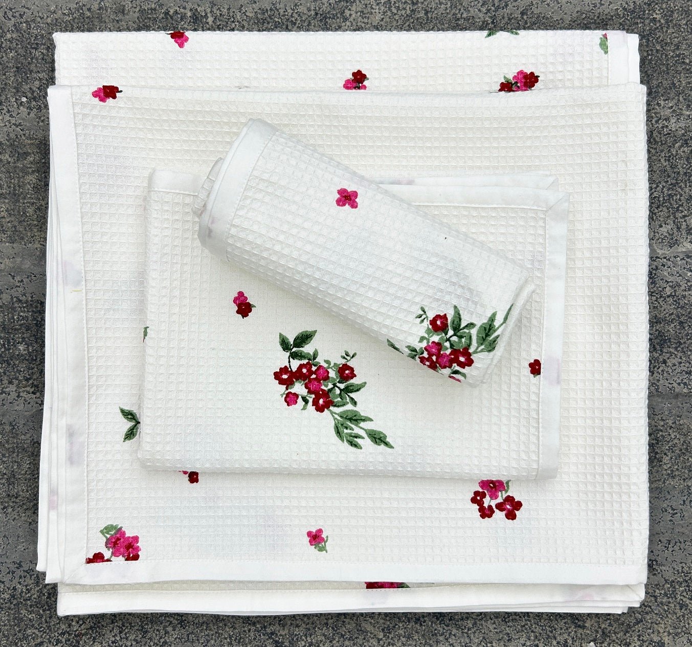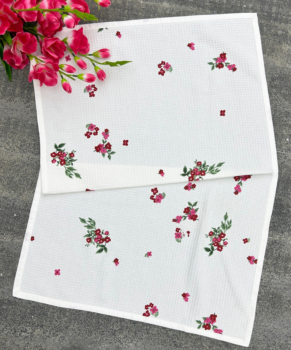 Design/Pattern: White waffle texture with a scattered floral print, featuring clusters of small flowers, primarily in shades of pink and deep rose red, complemented by green leafy stems on some pieces.
