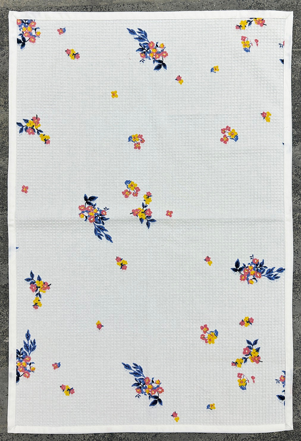 Design/Pattern: White waffle texture with a scattered floral print, featuring clusters of small flowers, primarily in shades of pink and deep rose red, complemented by green leafy stems on some pieces.