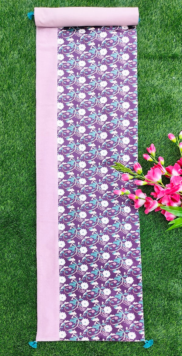 * Print: The main body of the table runner features a rich, dark purple poly velvet base. It is adorned with a delicate, trailing floral pattern composed of cream-colored blossoms, teal leaves, and swirling vines.