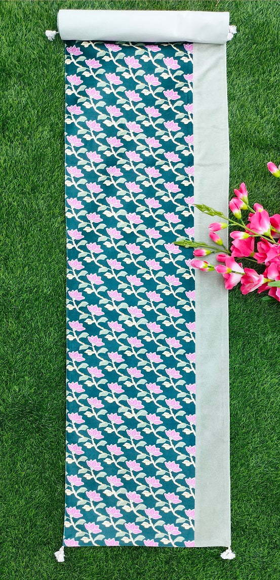* Print: The main body of the table runner features a rich, dark teal or deep green poly velvet base. It is adorned with a stylized, repeating floral pattern arranged in neat rows. The flowers are a vibrant pink or fuchsia, complemented by light green leaves and stems, creating a striking and balanced design against the background.