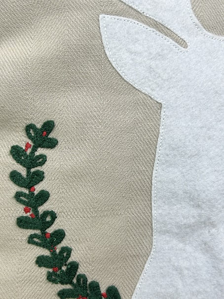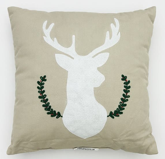 Reindeer Silhouette Decorative Throw Pillow Key Features Design: Features a prominent white reindeer silhouette created with a poly felt patch, beautifully accented with embroidered wreath detailing. Seasonal Appeal: A charming and elegant motif perfect for Christmas and winter season décor. Size: 18 x 18 inches (approx. 45 x 45 cm), a versatile square size for styling any couch, chair, or bed. Construction & Materials Component Material Specification Details Front Base Fabric Cotton Woven Herringbone Solid color base fabric (appears light beige/tan) with a distinct, subtle herringbone weave for a textured, high-quality look. Front Embellishment Poly Felt Patch and Embroidery Features a large, white poly felt patch cut into a deer/reindeer silhouette. Detailed holiday elements, such as a green and red berry wreath, are added using embroidery below the deer's head. Back Fabric Same as Front Base Fabric The back panel uses the exact same cotton woven herringbone fabric, ensuring consistency in texture and making the cushion durable and reversible. Closure Bottom Zipper Opening Includes a concealed zipper along the bottom edge, providing easy access to the cushion insert. Filler/Insert Non-woven Filler with Poly Fibre A cushion insert (filler) is included for immediate use and shape maintenance. Filler Filling15 Denier Poly Fibre Uses resilient polyester fiber filling to ensure the cushion remains soft, comfortable, and retains its loft. Summary Add a touch of rustic holiday charm with this beautiful 18x18'' Reindeer Patch Embroidered Cushion. The cover is made from a high-quality cotton base fabric featuring a subtle woven herringbone texture in a solid color (light beige/tan). The front panel showcases a large white reindeer silhouette created from a soft poly felt patch, enhanced by intricate embroidery forming a festive wreath of greenery and berries. The back panel uses the same durable fabric for consistency. Complete with a bottom zipper opening and a plush 15 denier poly fiber insert, this cushion is an elegant and festive addition to your winter home décor.