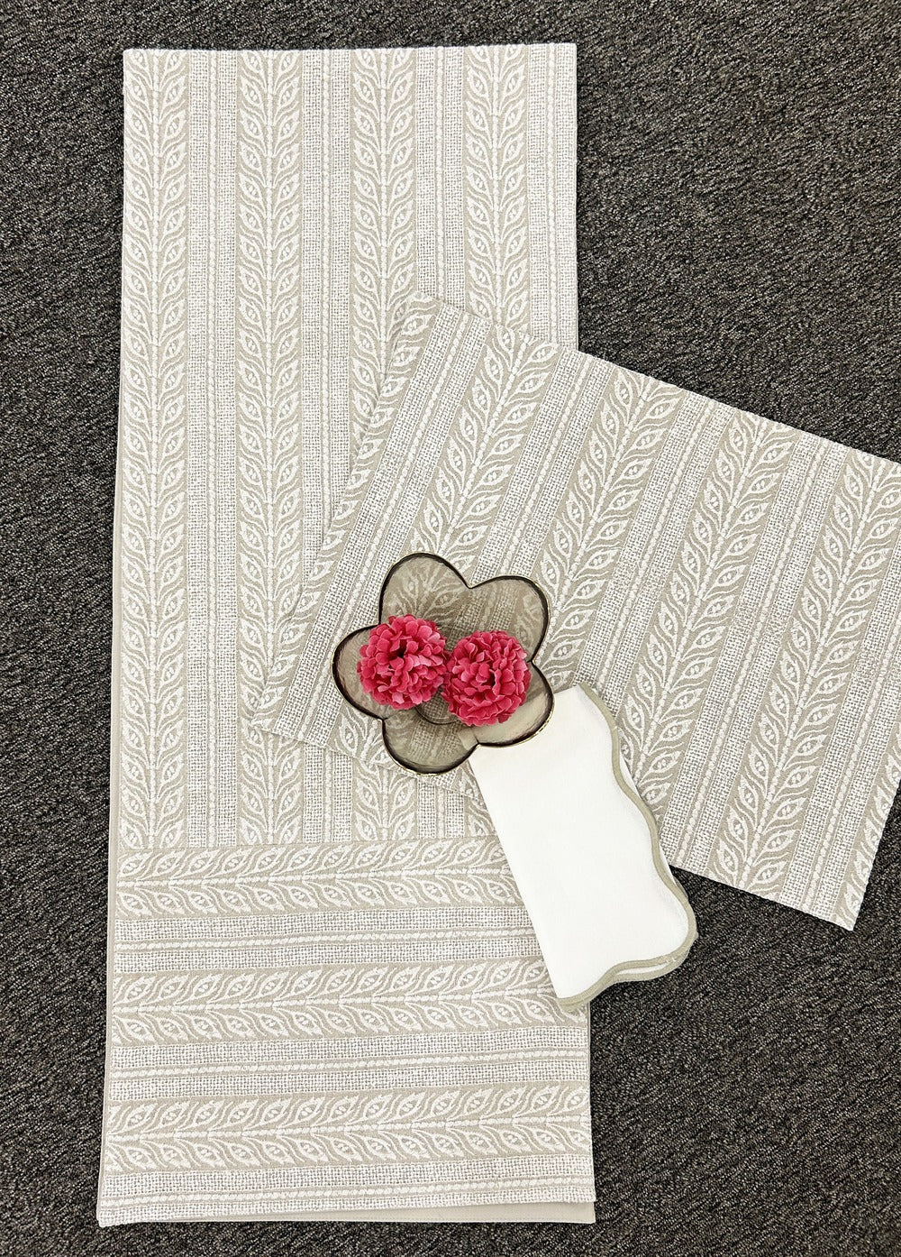 Cohesion: The identical schiffli embroidery pattern is carried across the runner and placemat, ensuring a beautifully coordinated and sophisticated table setting. The scalloped napkin edges provide a unique detail that ties into the overall intricate aesthetic.