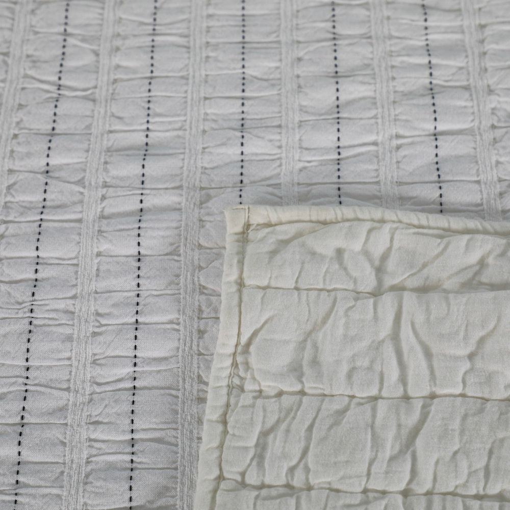 This charming and unique quilt set showcases a woven searsucker fabric with a delightful chawal taka (rice grain) pattern. The light and airy texture of the searsucker creates a naturally wrinkled surface, adding a touch of rustic charm.