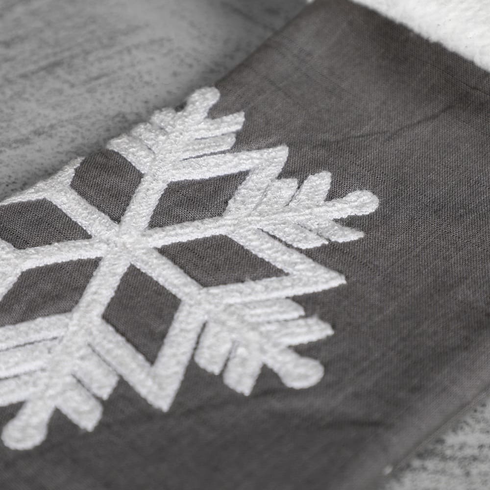 This festive Christmas stocking is crafted with a double-sided slub fabric in a solid color, adding texture and visual appeal. The front of the stocking features a beautiful snowflake embroidery design, creating a classic wintery look. To complete the design, the top of the stocking is adorned with a 5-inch cream-colored cotton velvet flap, adding a touch of elegance and warmth.