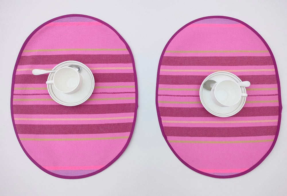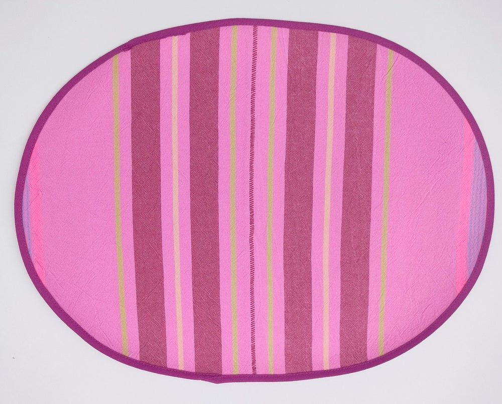 * Pattern: The body of the placemat is covered in a horizontal stripe pattern. The stripes vary in thickness and color, including shades of pink, magenta, plum, and subtle lines of light green or lime. This multi-tonal stripe pattern is both modern and playful.