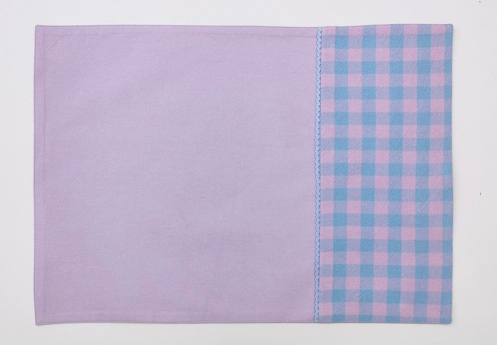 * Color and Pattern: The placemat has a two-part design. The majority of the surface is a solid, light color, while a vertical border on the right side showcases a playful pink and blue check pattern. This asymmetry provides a modern and unique aesthetic.