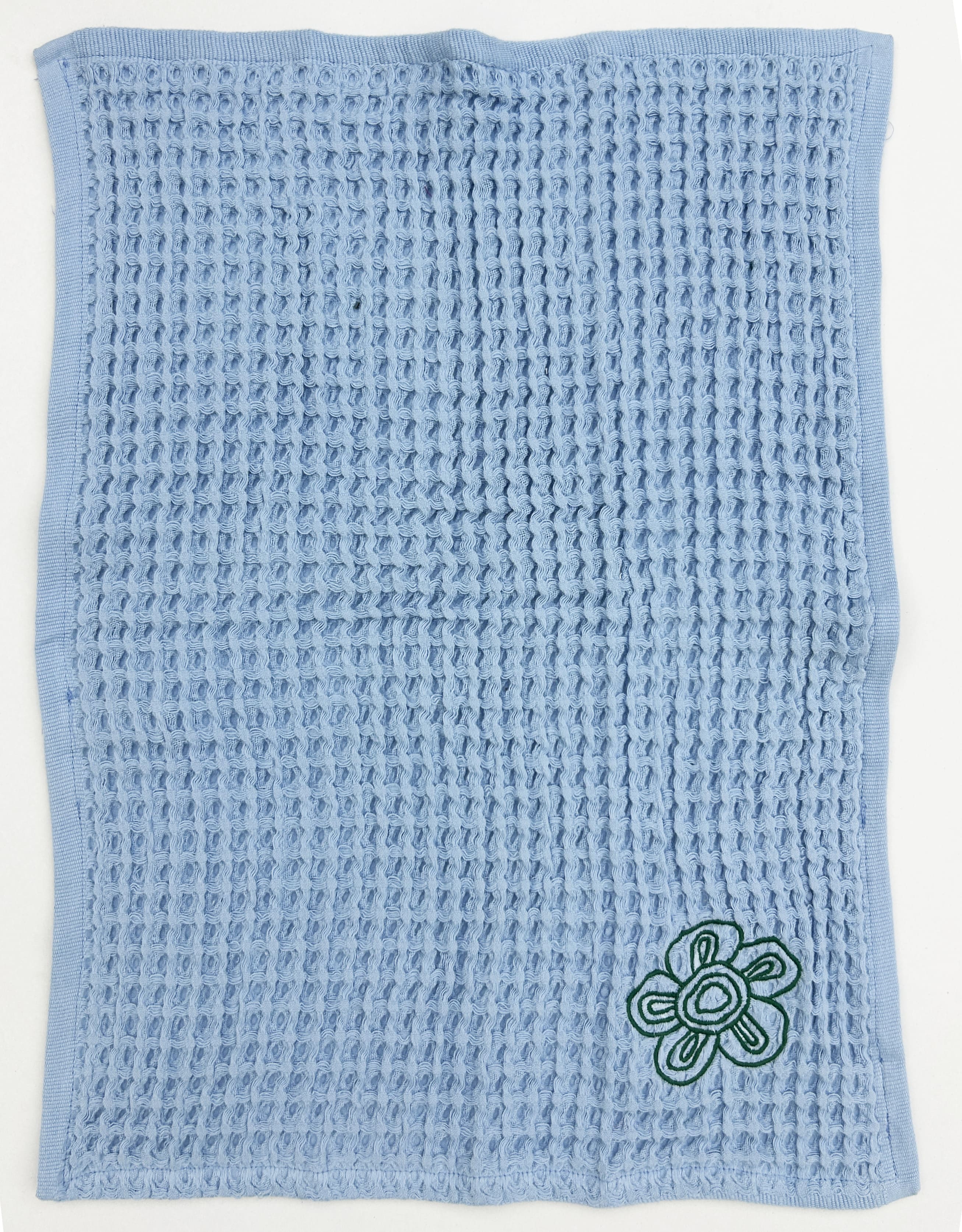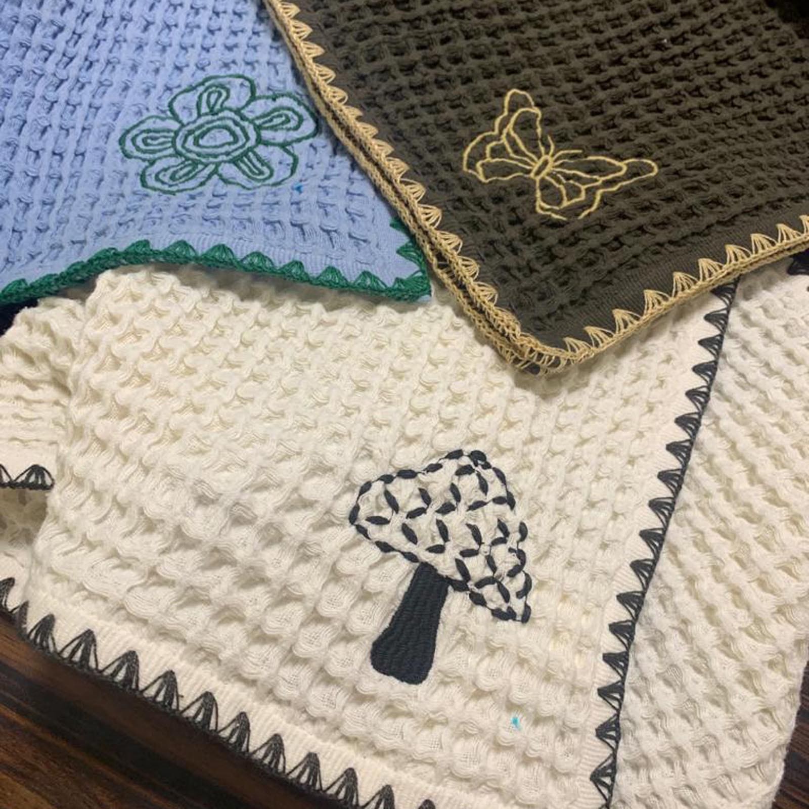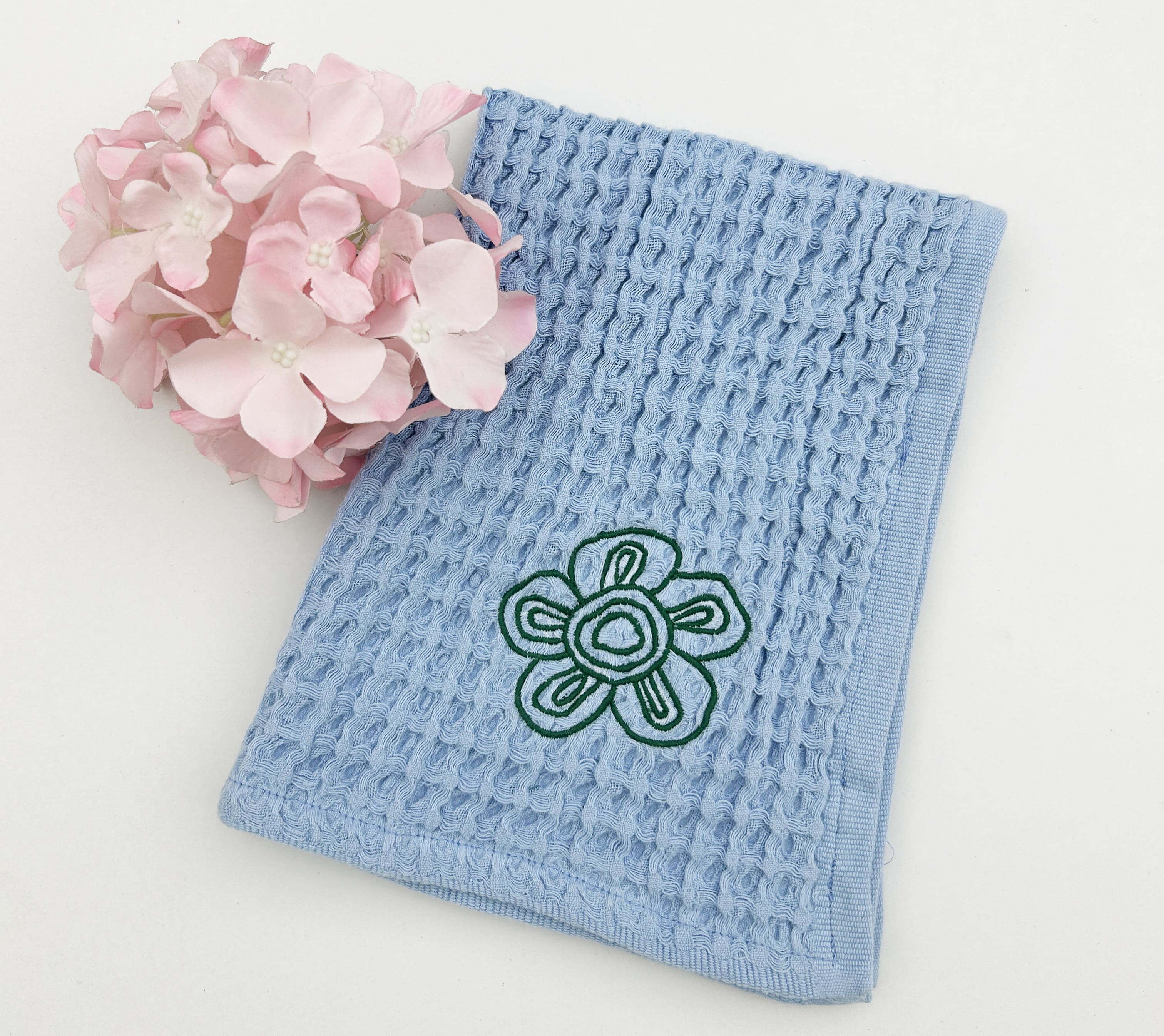 One towel is a soft light blue and adorned with a lovely floral embroidery in a coordinating green thread. The simple yet elegant flower adds a touch of nature-inspired charm.