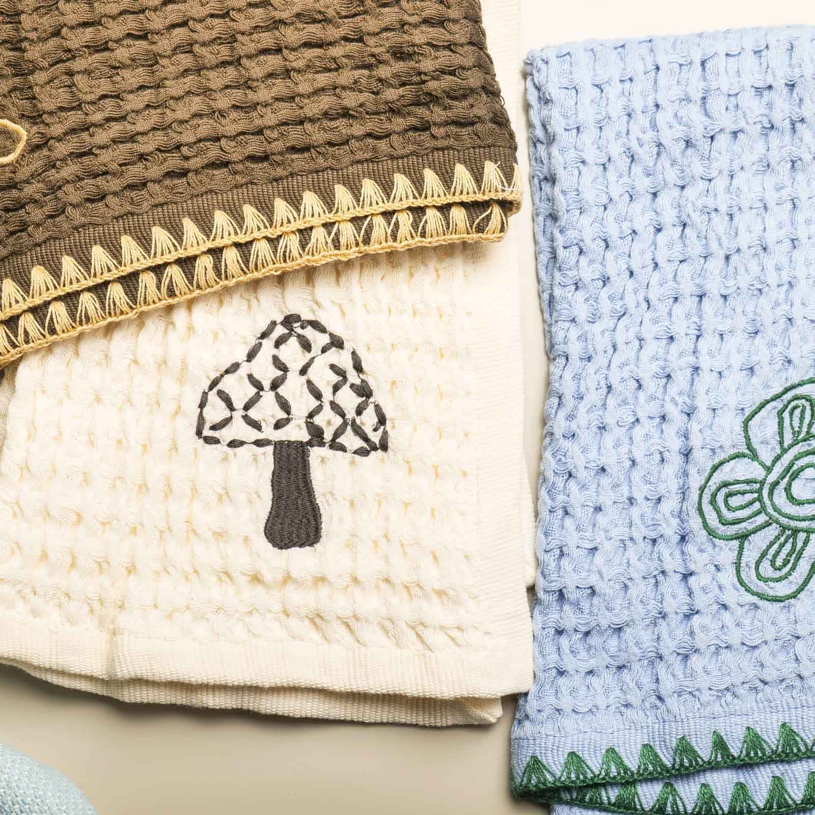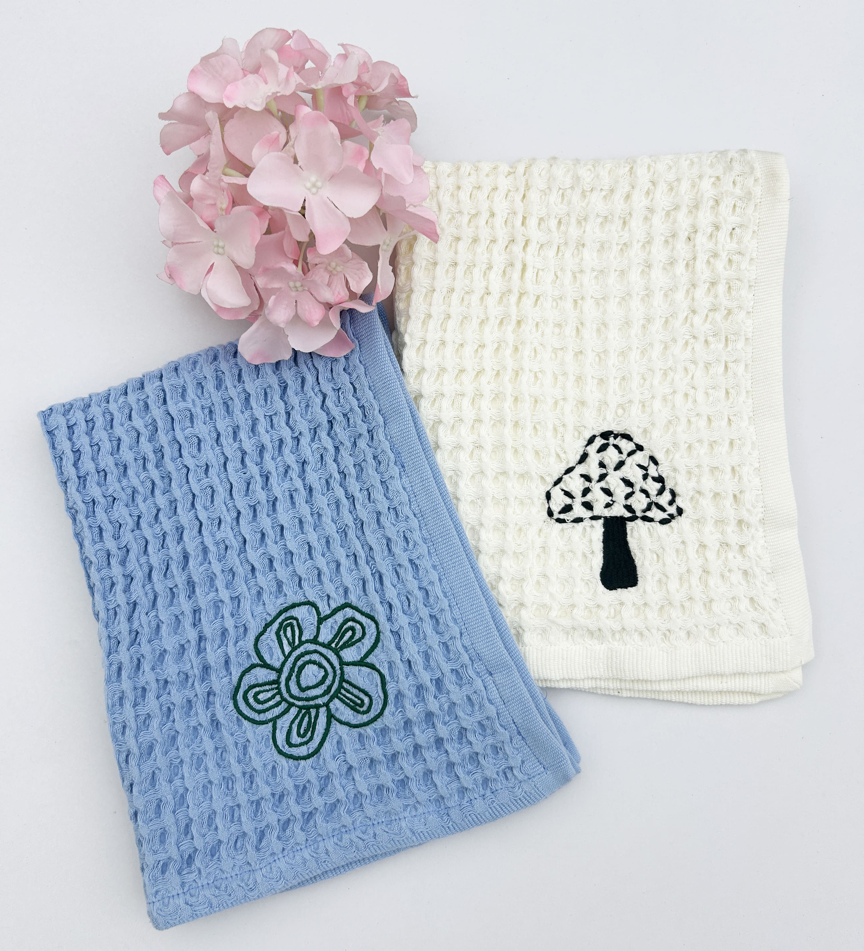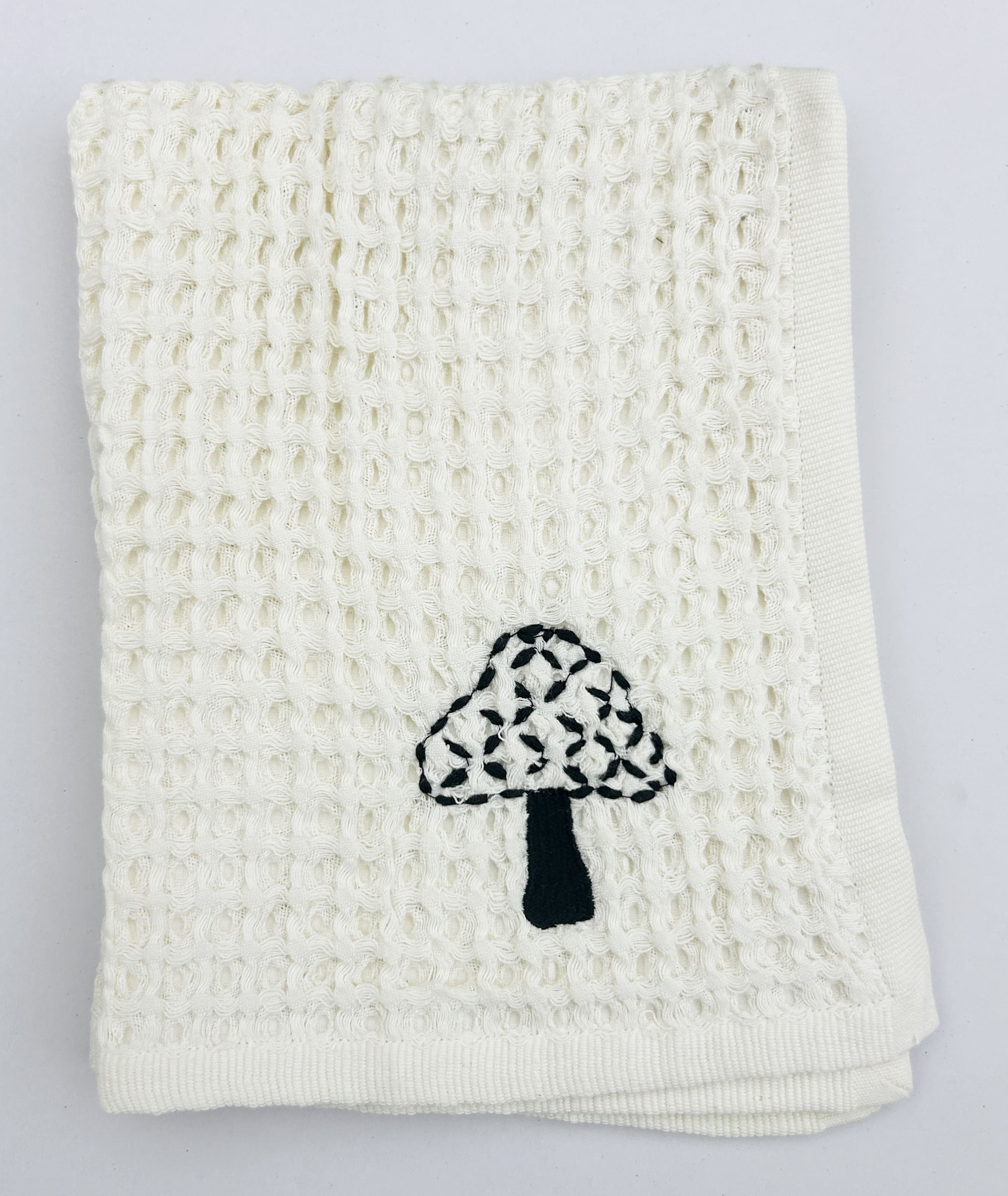 The second towel is a clean white and features a whimsical mushroom embroidery in black thread. This playful design brings a touch of fun to your kitchen decor.
