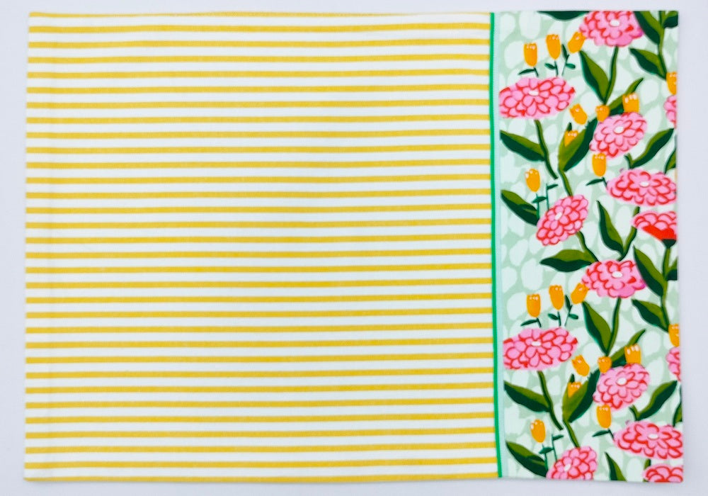 * Design: The placemat features a two-part design. The top section showcases a vibrant floral print with large pink and reddish flowers and green leaves on a light green background with a subtle geometric pattern. The bottom and larger section consists of a classic vertical stripe pattern in alternating yellow and white. A thin green cotton tape separates the two design sections, adding a neat and finished edge.