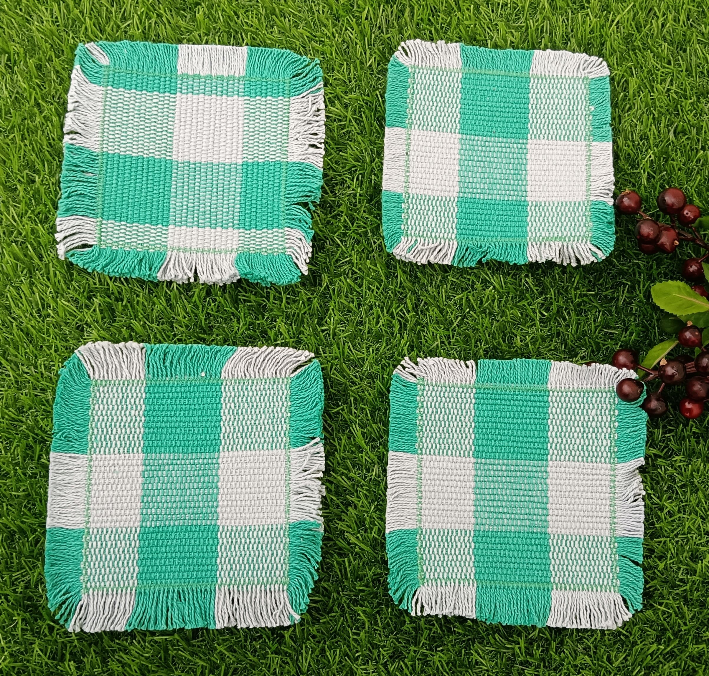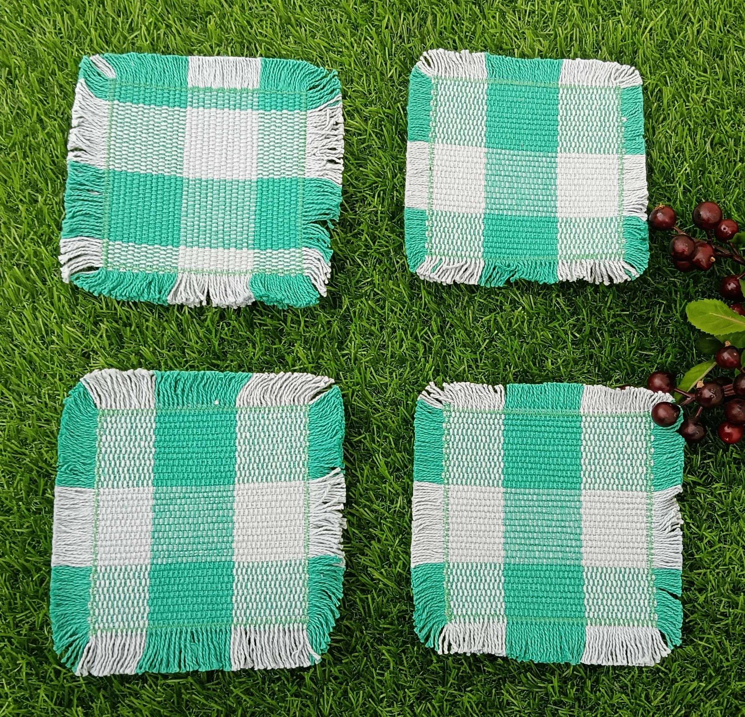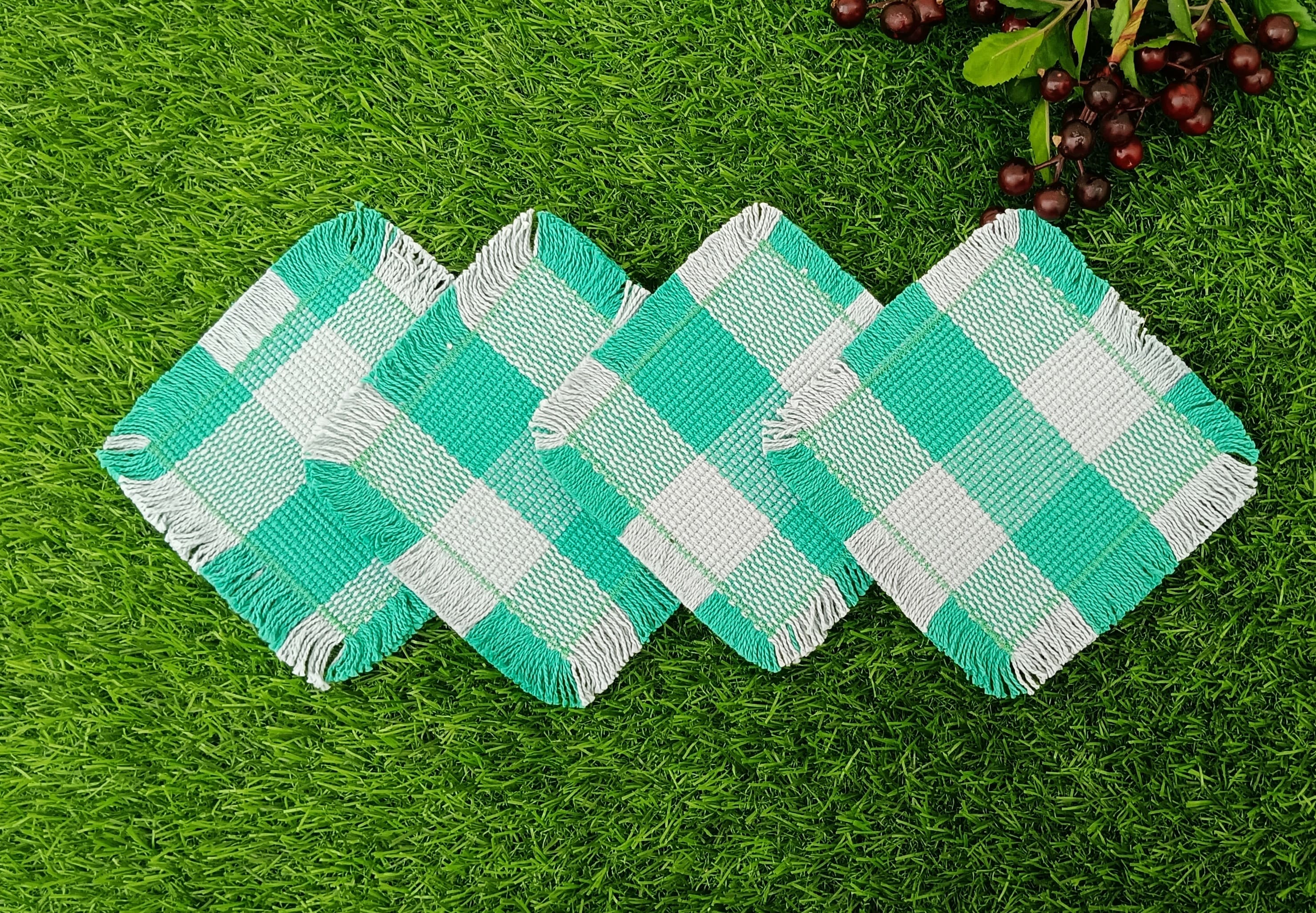 Key Features: Material & Weave: The coasters are made from a woven fabric, likely 100% cotton. They feature a unique "rib check" or "ribbed check" pattern, which is created by a prominent, tactile weave. This texture gives the coasters a rustic, almost hand-loomed feel.