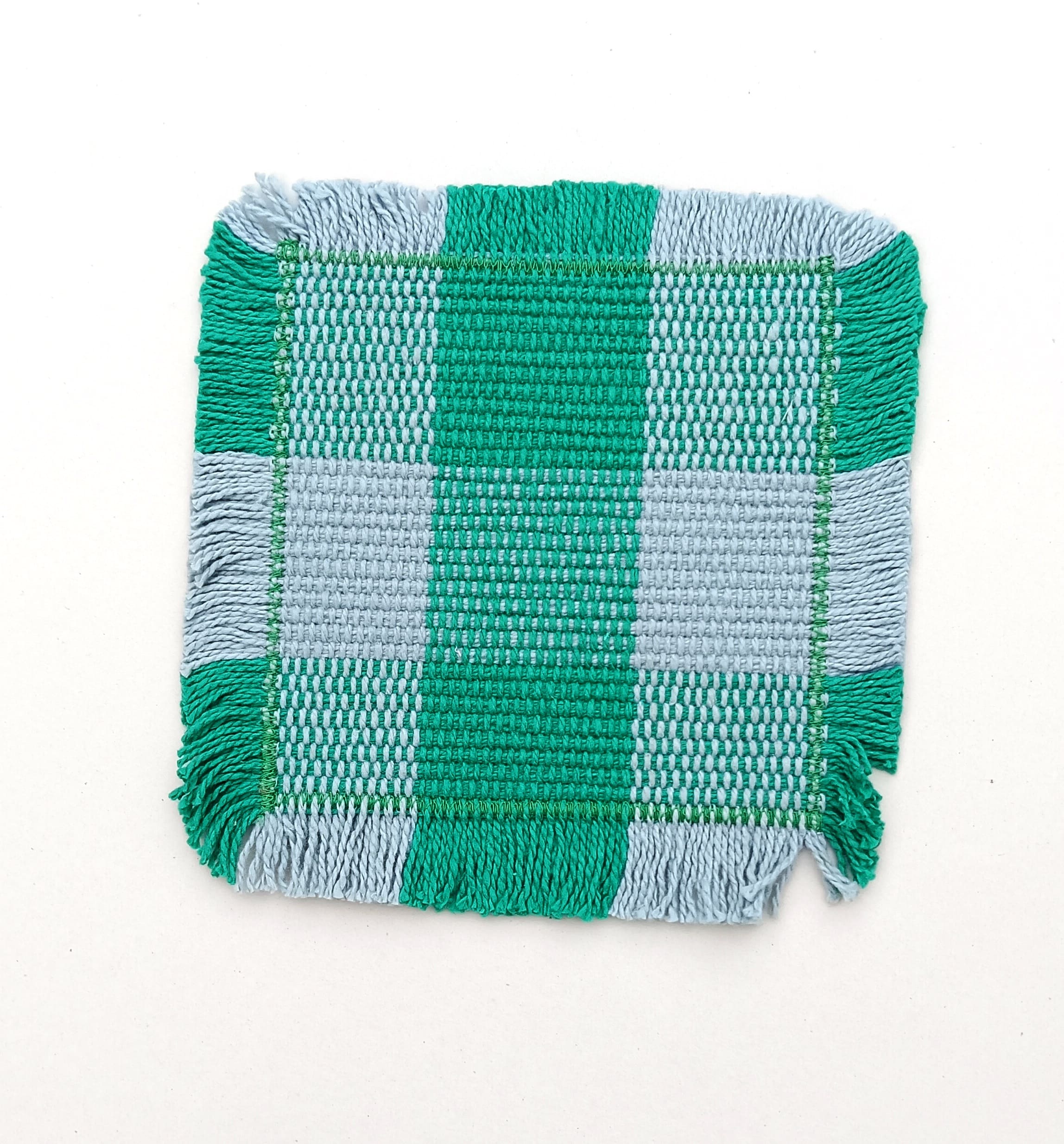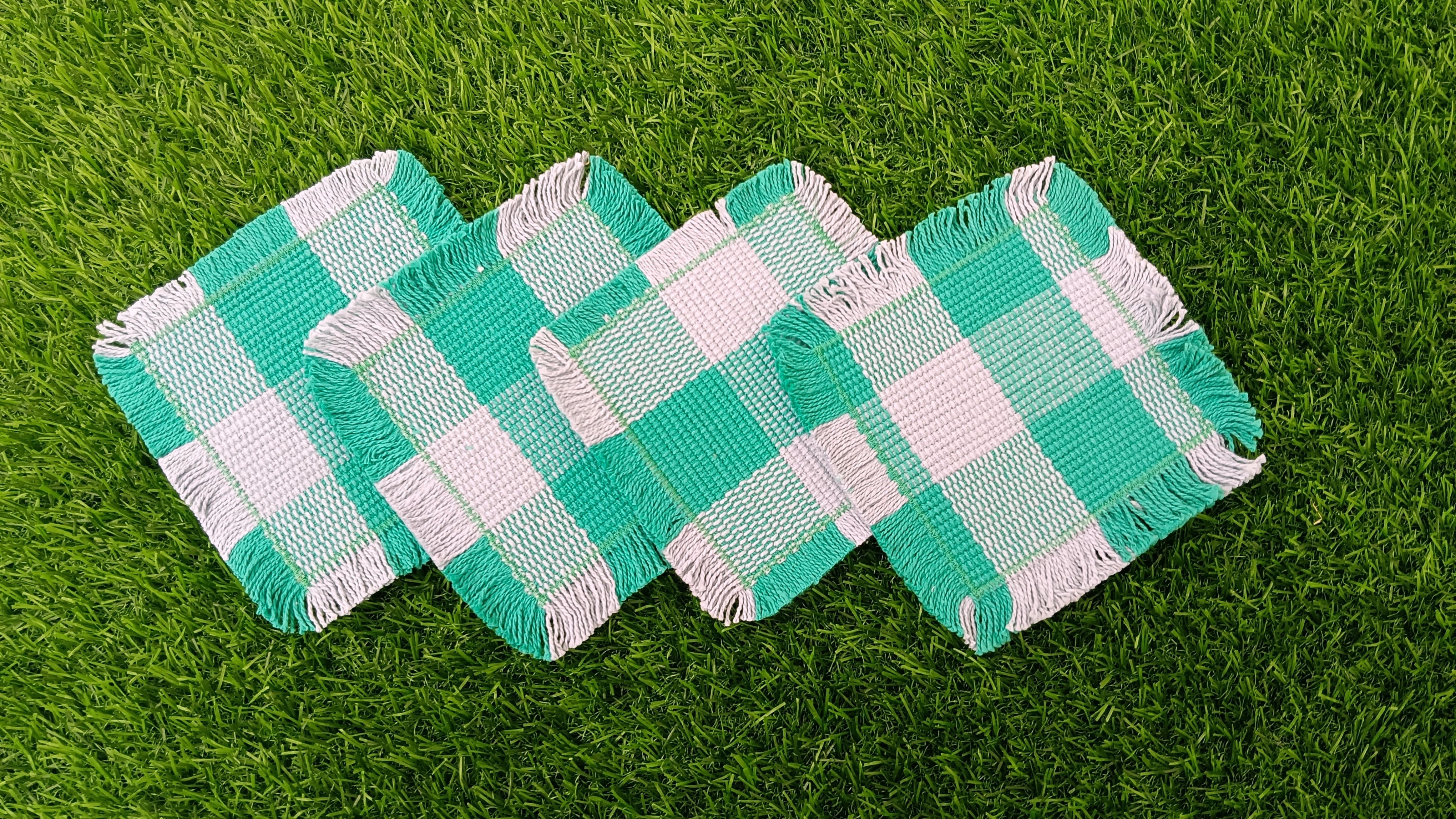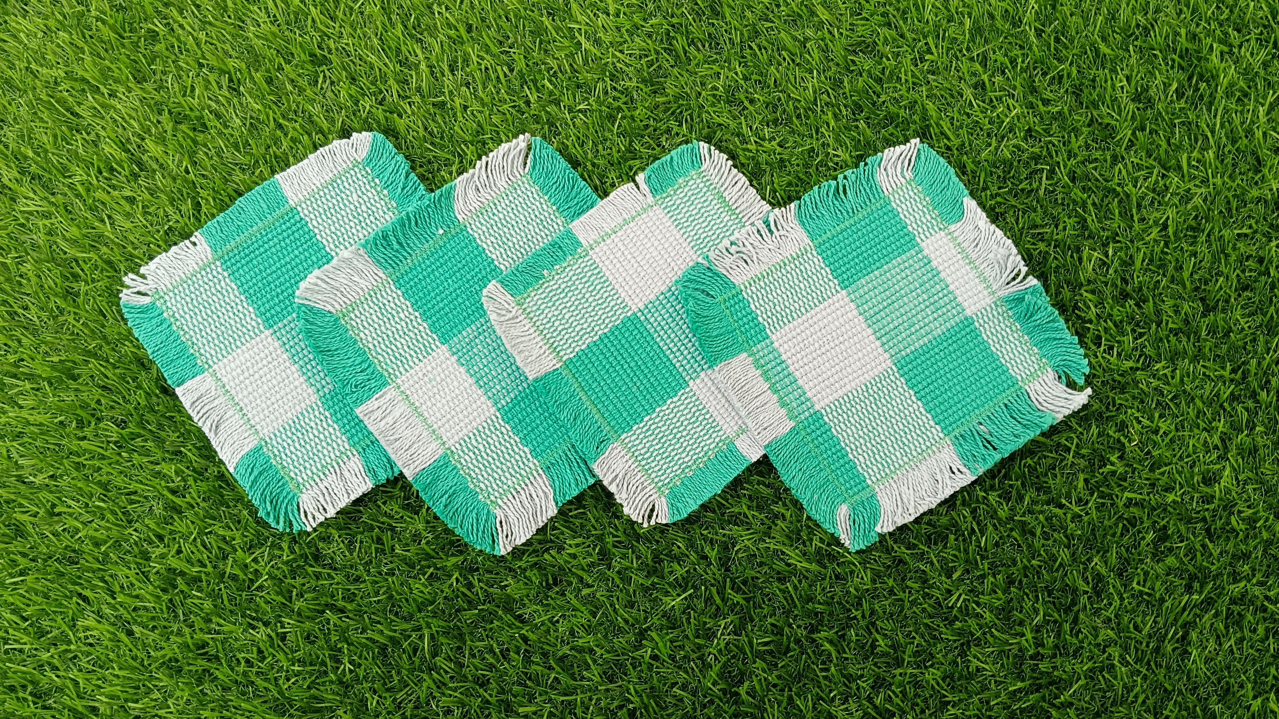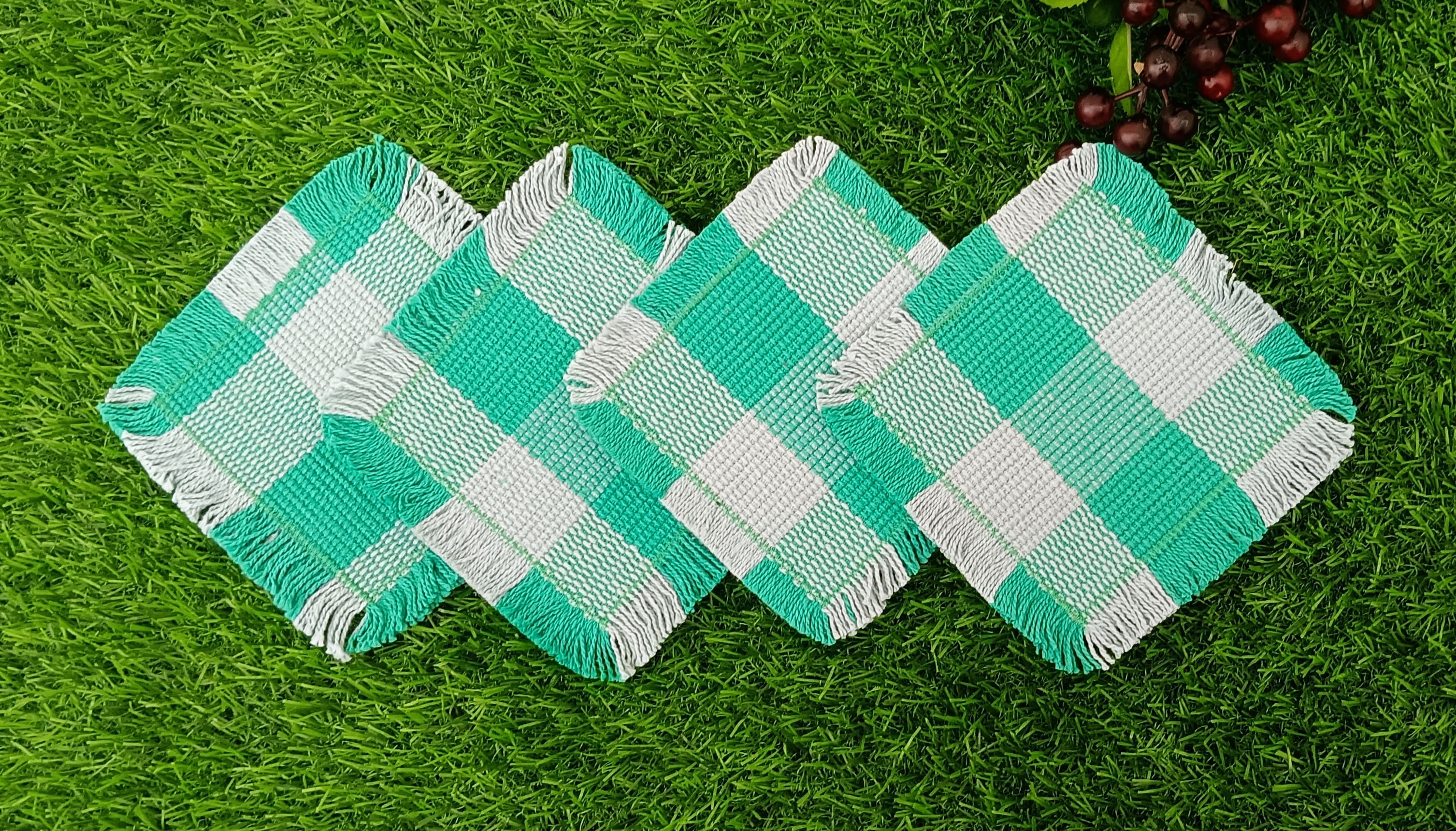 Key Features: Material & Weave: The coasters are made from a woven fabric, likely 100% cotton. They feature a unique "rib check" or "ribbed check" pattern, which is created by a prominent, tactile weave. This texture gives the coasters a rustic, almost hand-loomed feel.