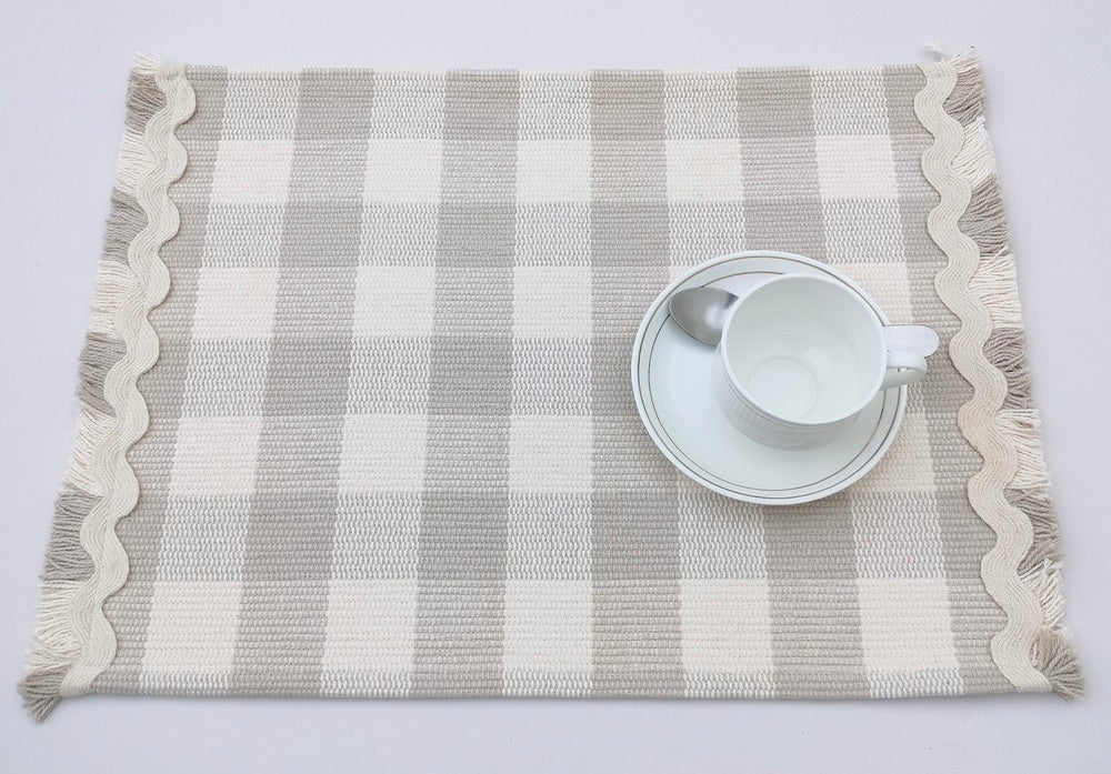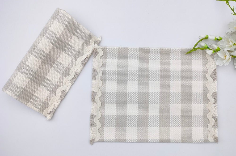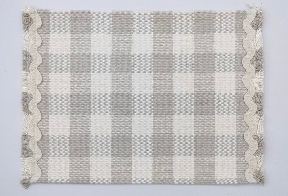 * Trim: The placemat is embellished with a decorative ric-rac tape, a flat, braided trim characterized by its distinctive zigzag shape. The ric-rac is the same color as the lighter tone in the check pattern.