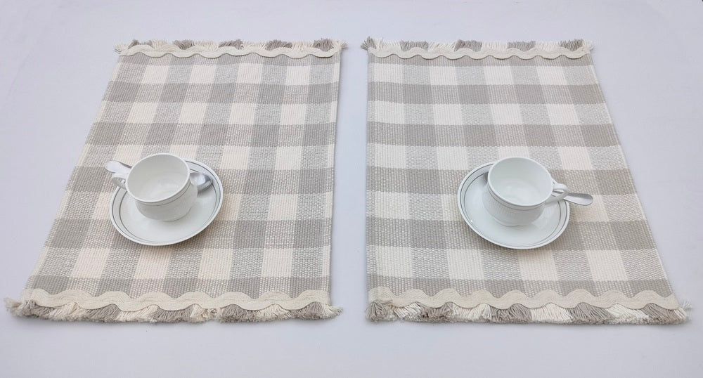 * Placemat: A durable woven fabric with a "rib check" pattern. This pattern is created by alternating sections of a prominent rib weave (vertical raised lines) and a plain or subtle weave, forming a checkerboard effect. The colors are a light, neutral grey and off-white or cream, giving it a classic and timeless appeal.