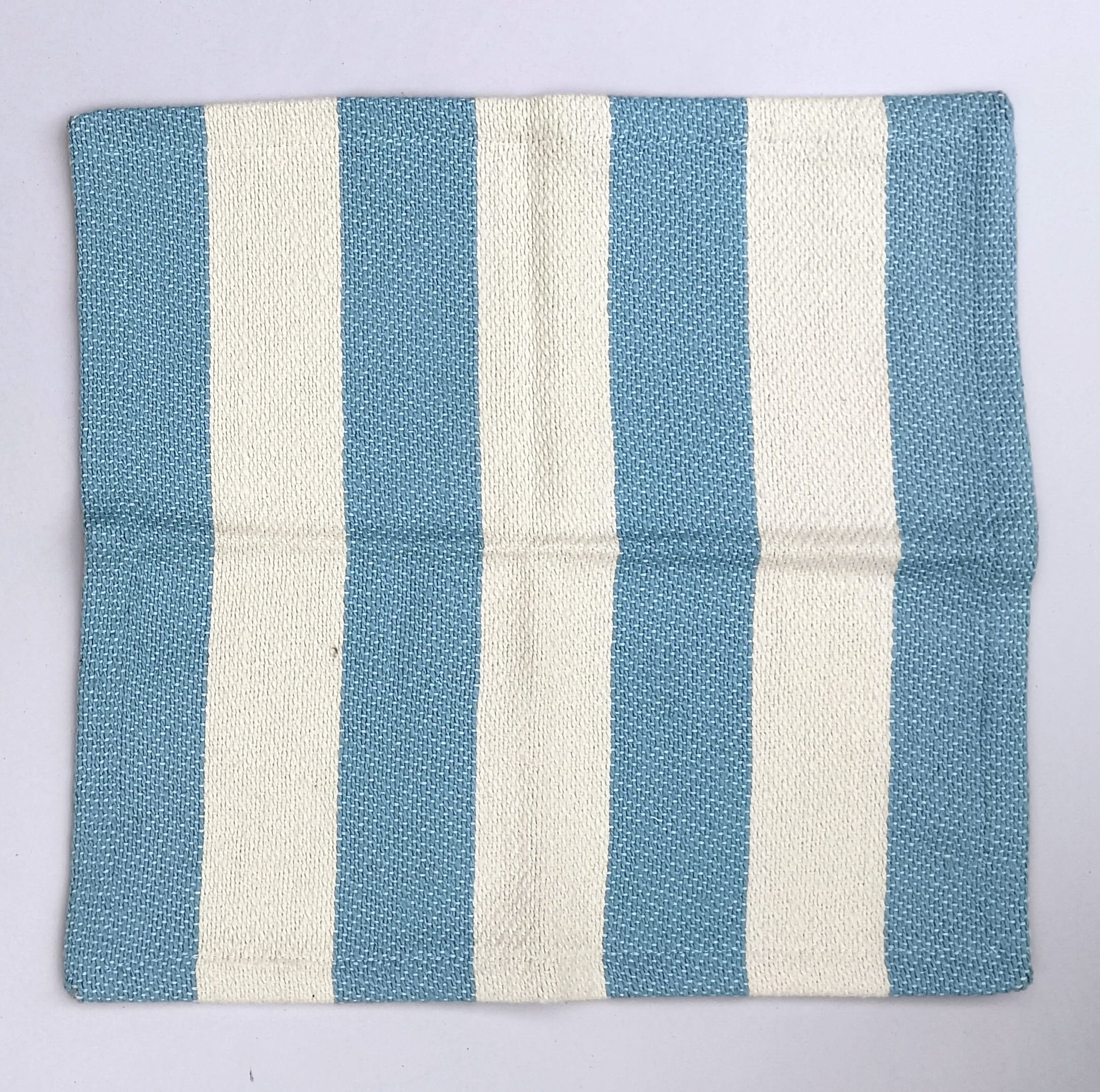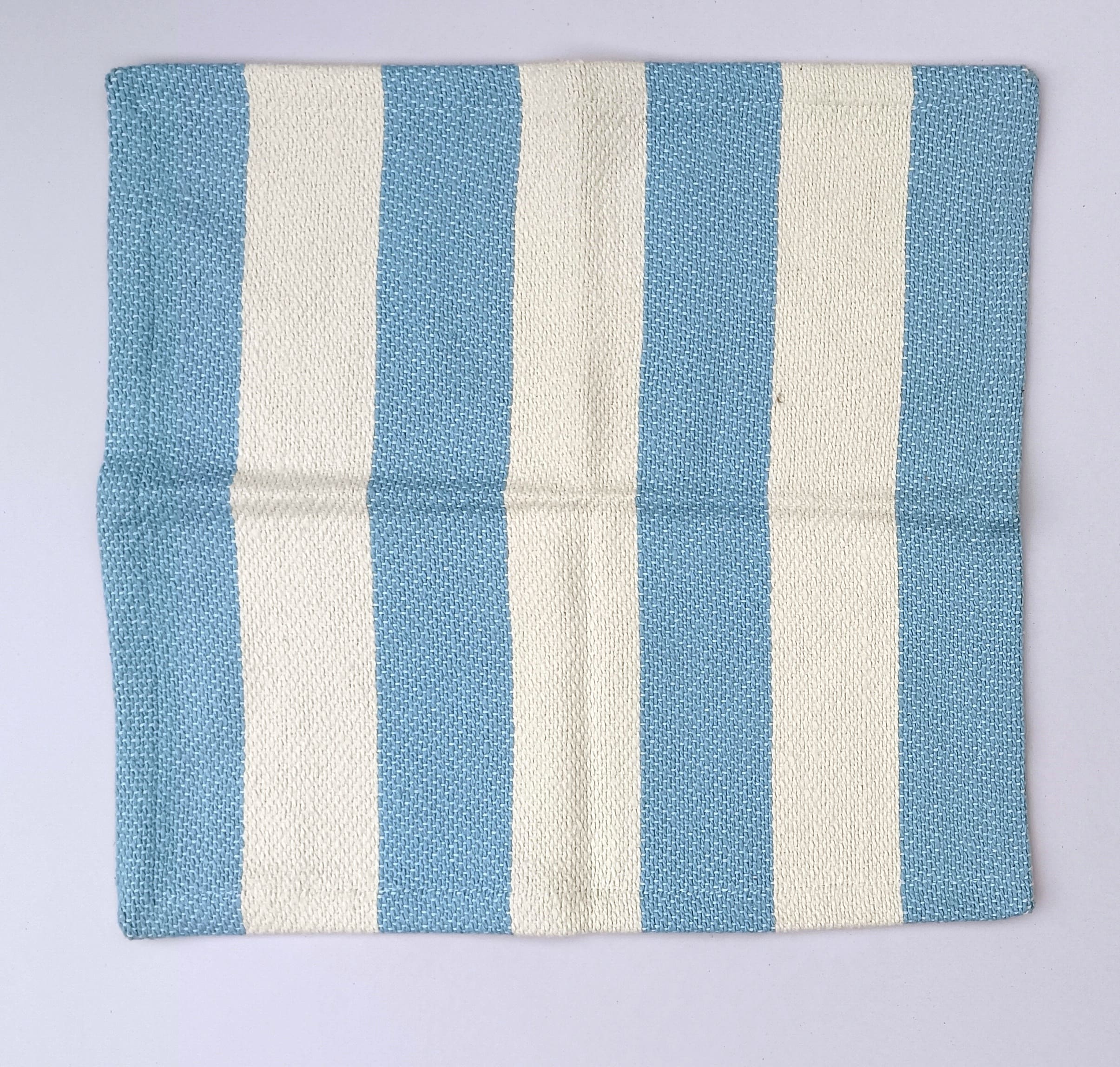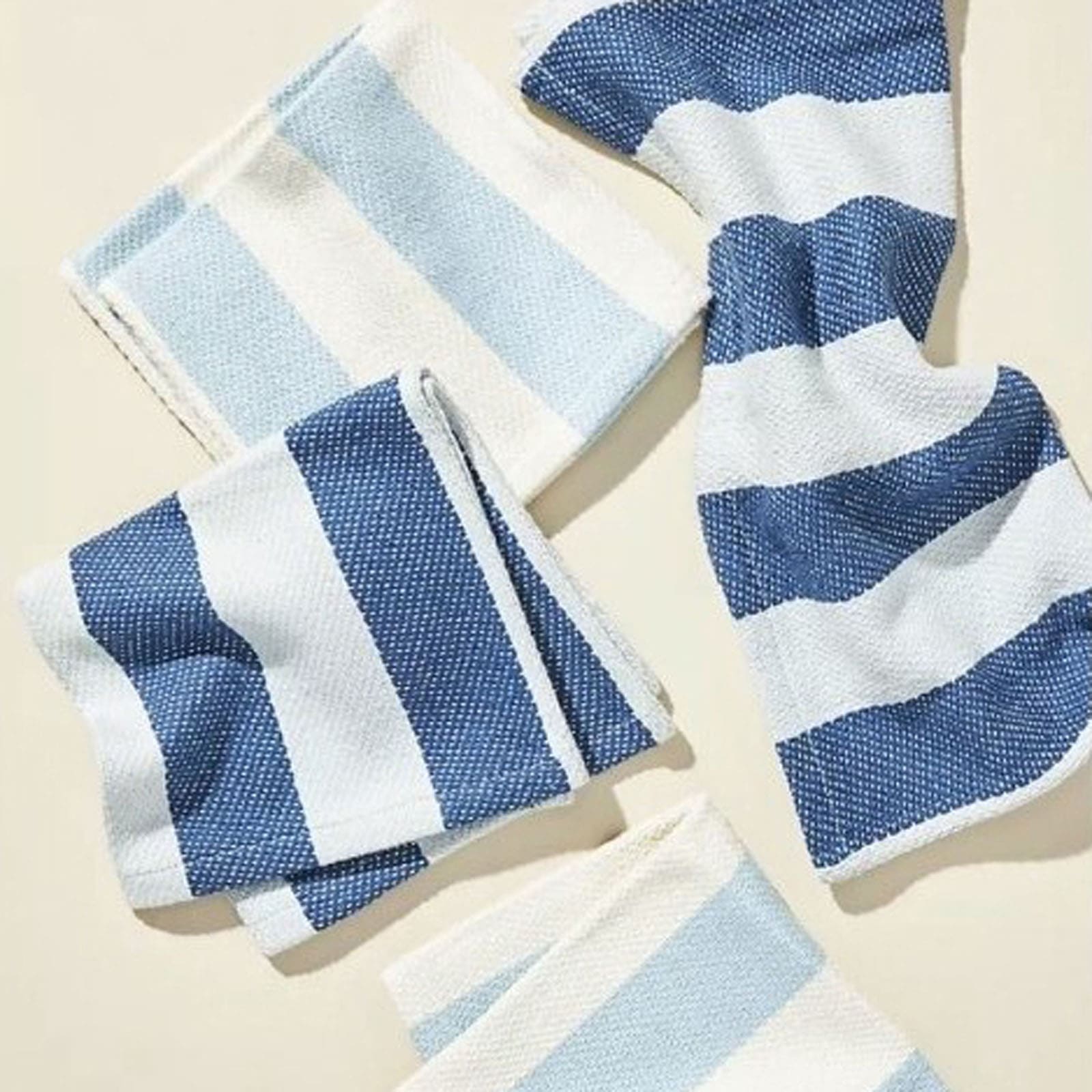 Design: The set features a classic woven stripe pattern in a warm and inviting color palette. The vertical stripes include shades of blue, green, yellow, and red, creating a cheerful and timeless design that can complement a wide range of kitchen decors.